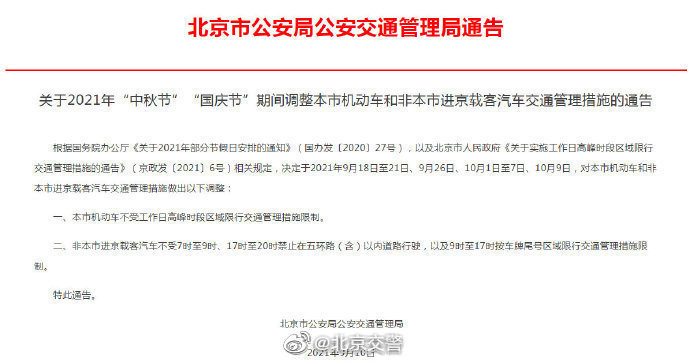 10月1日至7日、10月9日,对本市机动车和非本市进京载客汽车交通管理措施做出以下调整:1.本市机动车不受工作日高峰时段区域限行交通管理措施限制。2.非本市进京载客汽车不受7时至9时、17时至20时禁止在五环路(含)以内道路行驶,以及9时至17时按车牌尾号区域限行交通管理措施限制。