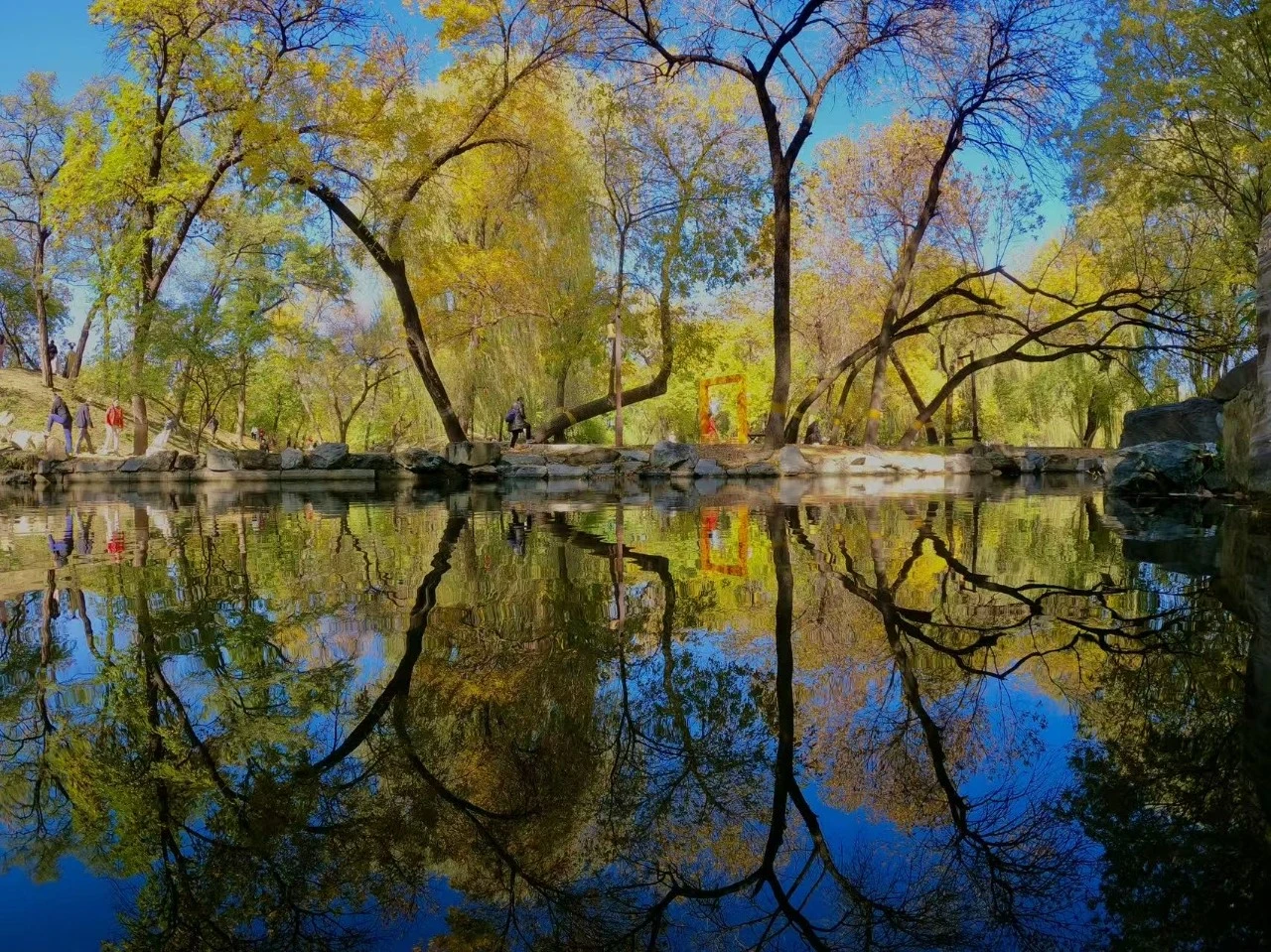 金黄的树叶、澄澈的蓝天与静谧的湖水交相辉映,构成了一幅绝美的秋日画卷。园内,苹果榭周边的树木褪去绿装,换上了金黄、橙红的斑斓外衣。阳光透过枝叶洒下,在地面形成斑驳的光影。