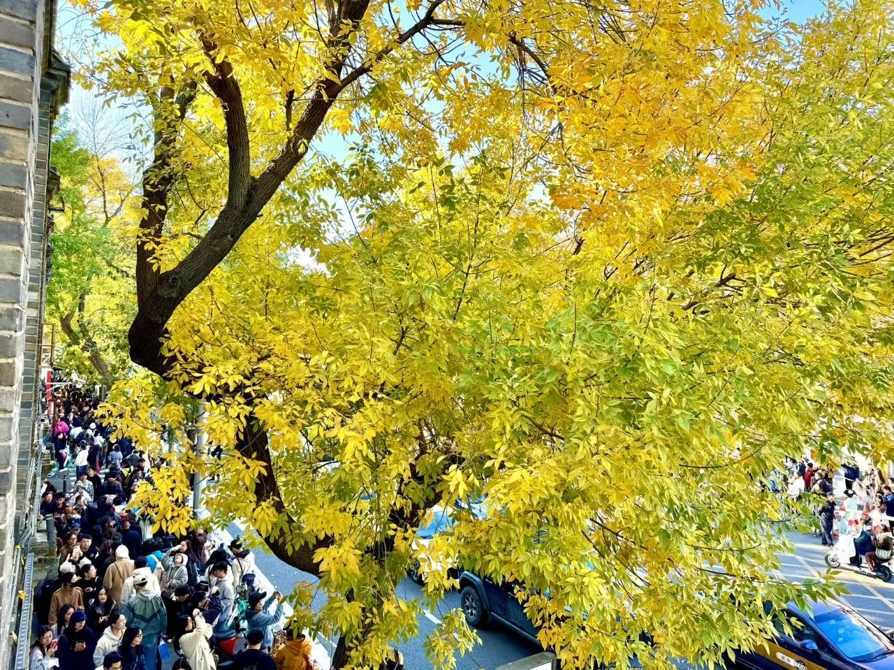 10月19日,记者在现场看到,满树金黄的叶片在微风中轻轻摇曳,与周边的历史建筑相映成趣,成为京城秋日里的一道独特风景线,在街头格外醒目,吸引了众多市民前来拍照打卡。