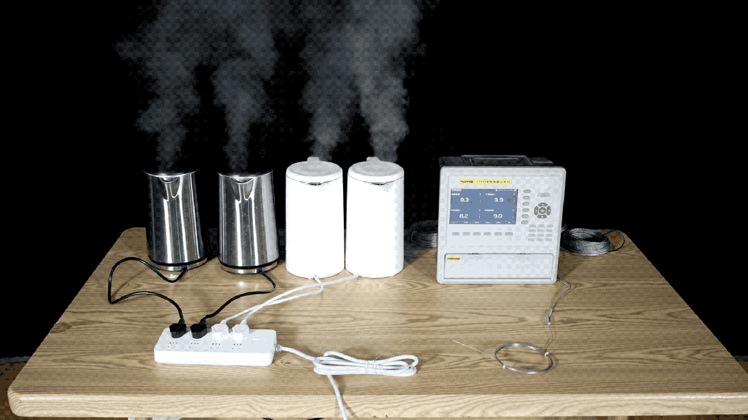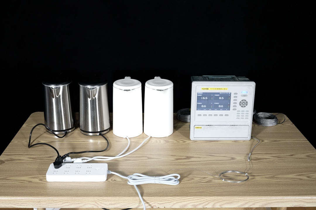 消防员将4台同规格的电热水壶插在同一个国标插线板上,并将电线用捆扎带绑在一起,倒入相同的水量后4台水壶同时工作,用测温仪实时监测电线的温度。随着时间的推移,电线冒起缕缕青烟。