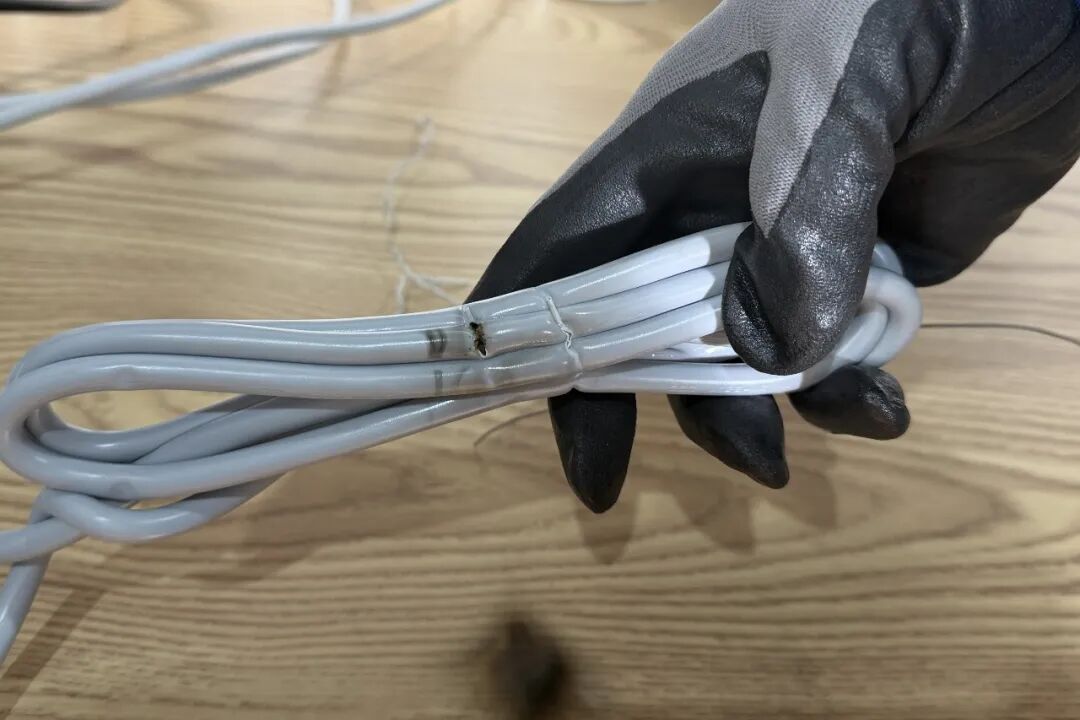 在温度达到217.2℃时,捆成一团的电线突然发出爆响声,并在接触部位发生打火现象,电线绝缘保护层破损、导线裸露。