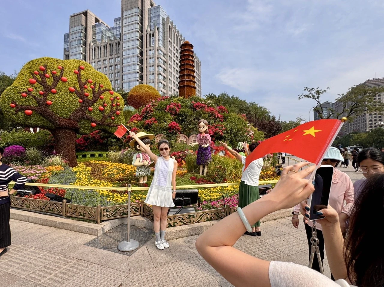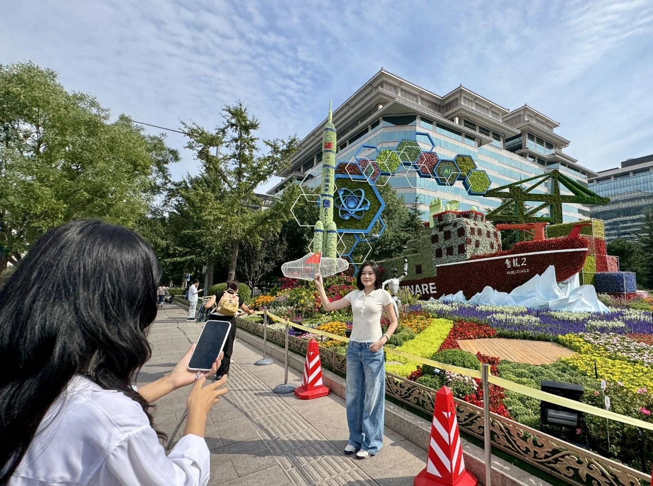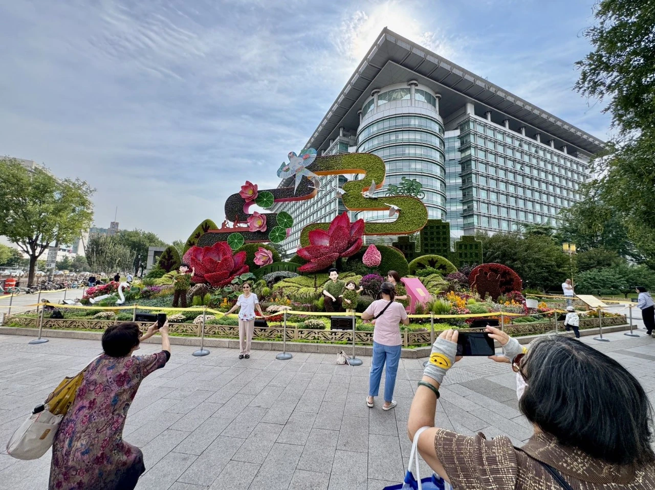 “九三阅兵时看过这些花坛,比较壮观,振奋人心。现在换成国庆花坛,看着比较喜庆,也很棒。”