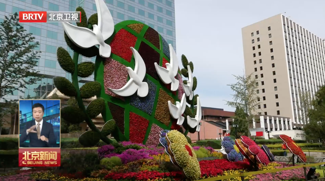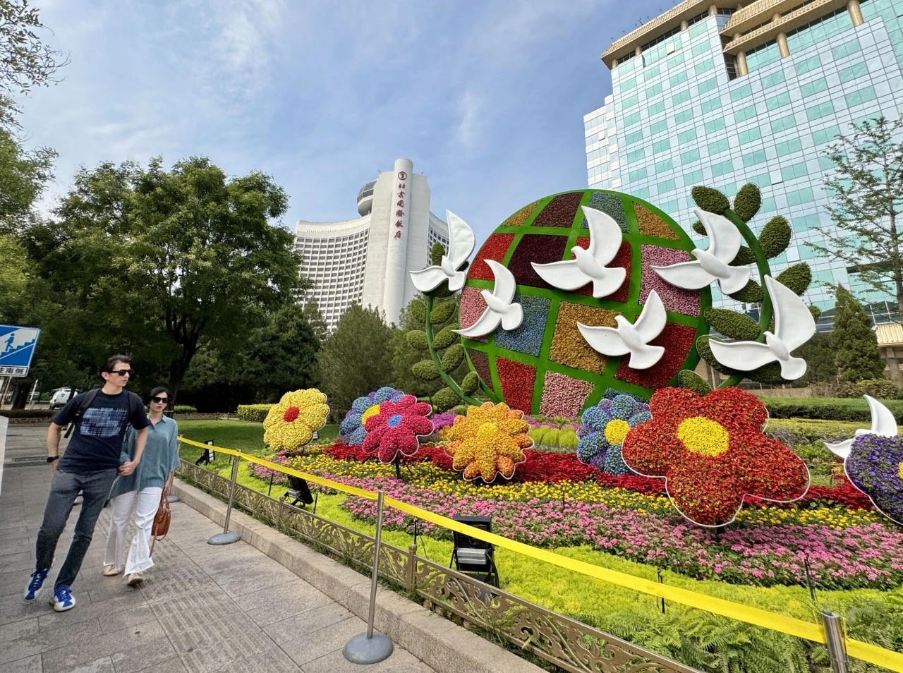 建国门西北角的“和平发展”花坛以地球、橄榄枝、和平鸽为主景。