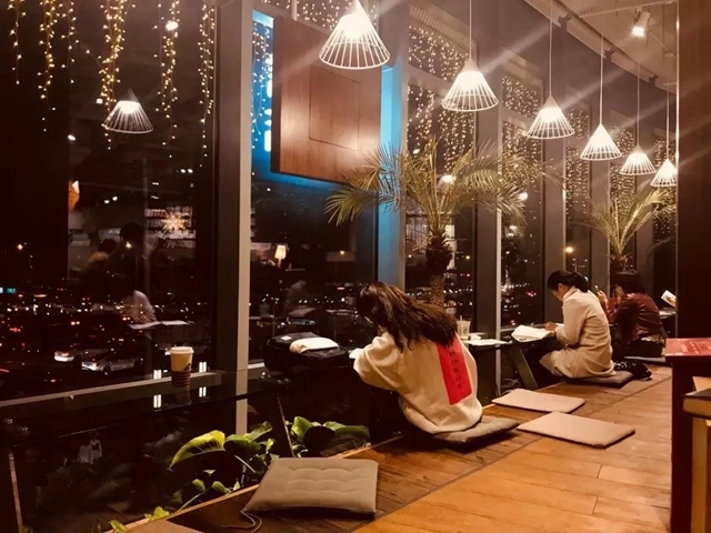 继续往里走,你会发现书店还有一个艺术庭院般的二层复式结构,这里是阅读休息区,带有禅意的设计风格营造着别样的阅读场景。几十面从屋顶垂到地面的大落地窗,成为了书店的幕墙,临窗眺望,外面是车水马龙的街景。“日出而作,日落而息”,书店设计强调人与自然相合的状态,所以在白天,这里几乎不需要开灯,早上阳光透过敞亮的落地窗洒入店内,直到日垂西山,夜色缓缓降临,书店才会落下窗帘,暖色的星星灯映衬着屋外的月色,闪闪发亮。