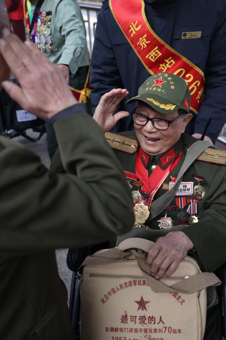 “雄赳赳,气昂昂,跨过鸭绿江……”95岁的抗美援朝老兵陈莺荞胸前挂满了勋章,刚下车,便和大家一起唱起了《中国人民志愿军战歌》,歌声虽不洪亮,却字字铿锵。“来到北京特别高兴,感受到了大家对我们的关心。我想看看天安门广场,去瞻仰毛主席……”老人的话语道出了众多老兵的心声。