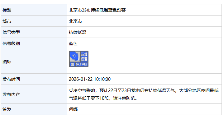 受冷空气影响,预计22日至23日我市仍有持续低温天气,大部分地区夜间最低气温将低于零下10℃,请注意防范。