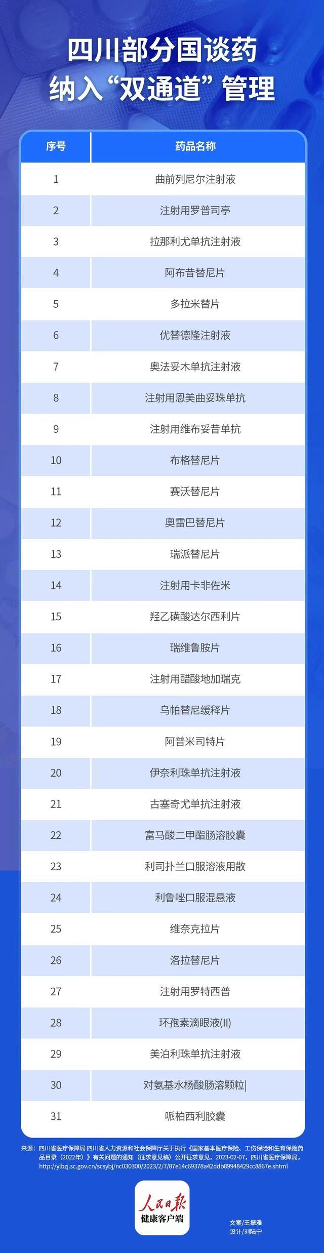 据悉,四川省将国家2022年谈判新增的曲前列尼尔注射液等31个药品纳入单行支付管理的药品名单。王怡波介绍,“这31种药物主要包含创新、罕见病新药以及临床急需药物,纳入双通道后,这些药物不设起付线、住院、门诊同样报销,平均报销比例在70%左右。对于纳入双通道的药物,药品供应、医院采购方面医保局会做好保障工作。”