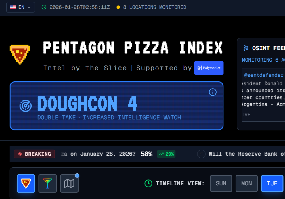 北京时间查询“五角大楼披萨指数报告”(@PenPizzaReport)发现,在当地时间1月27日,五角大楼附近的披萨店,棒约翰和皮扎托两家在当晚七八点钟,披萨的订单较以往同期出现较大增幅。“DEFCON(戒备状态)为4级,高度戒备、加强情报监控。