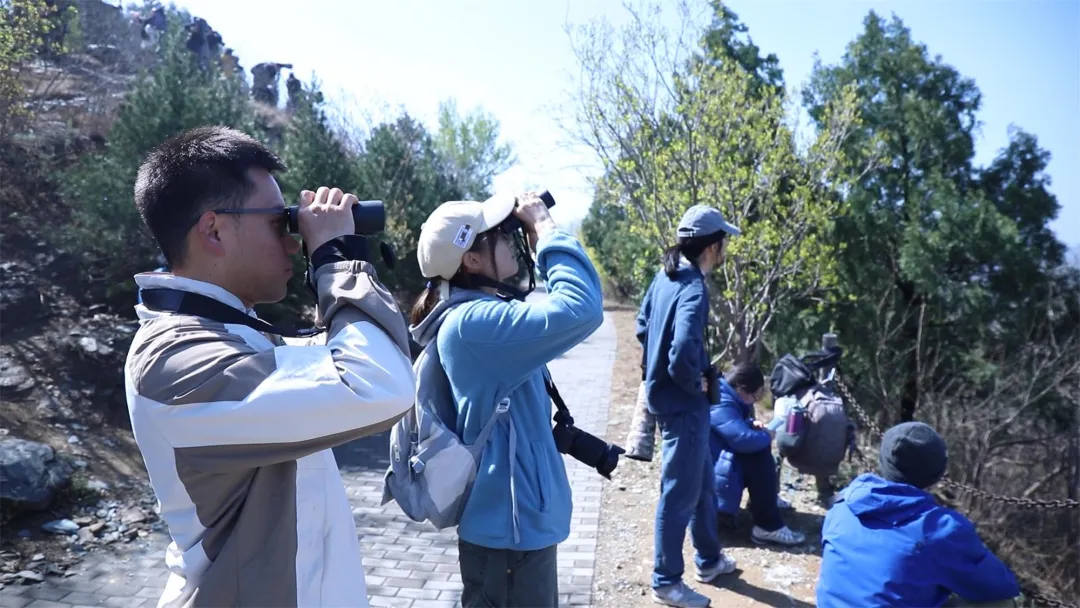 大家或举着双筒望远镜凝神眺望