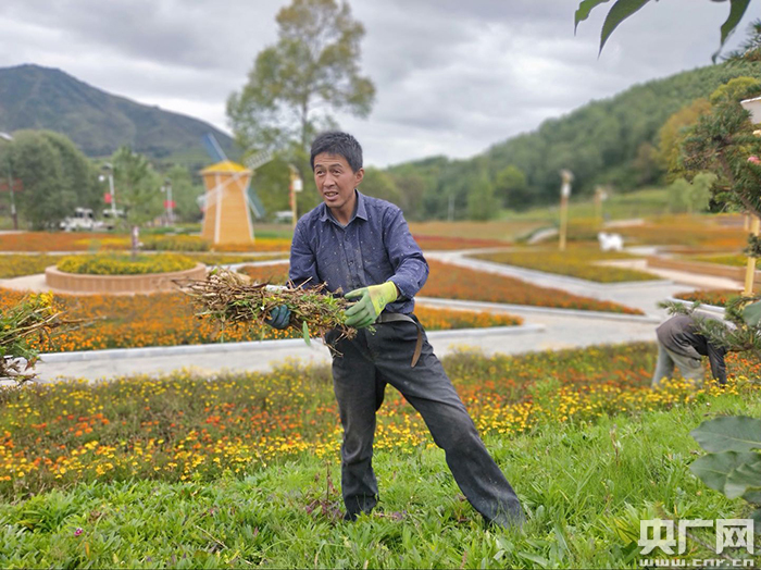 村民正在打理村内花草(央广网记者 王启慧 摄)