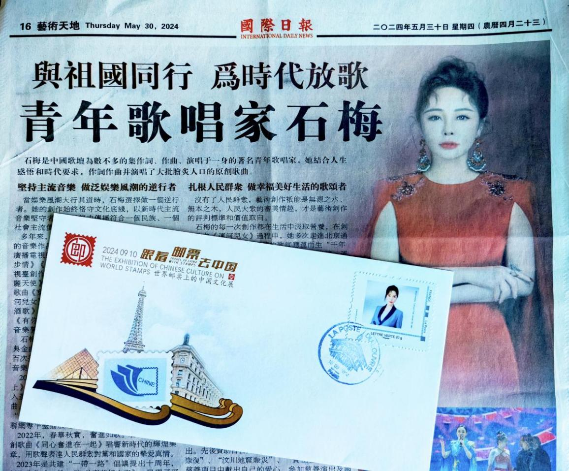 图为2024世界邮票上的中国文化展在巴黎开幕 国际日报刊登石梅介绍