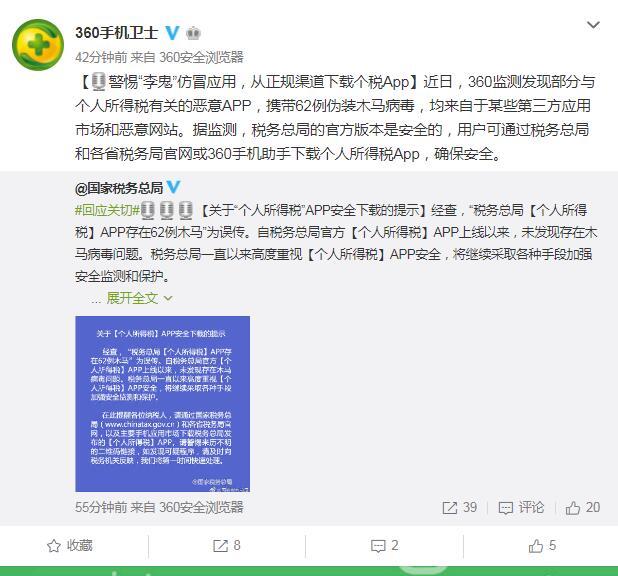 国家税务总局新闻宣传办公室今日通报称,经查,"税务总局【个人所得税】APP存在62例木马"为误传。自税务总局官方【个人所得税】APP上线以来,未发现存在木马病毒问题。税务总局一直以来高度重视【个人所得税】APP安全,将继续采取各种手段加强安全监测和保护。