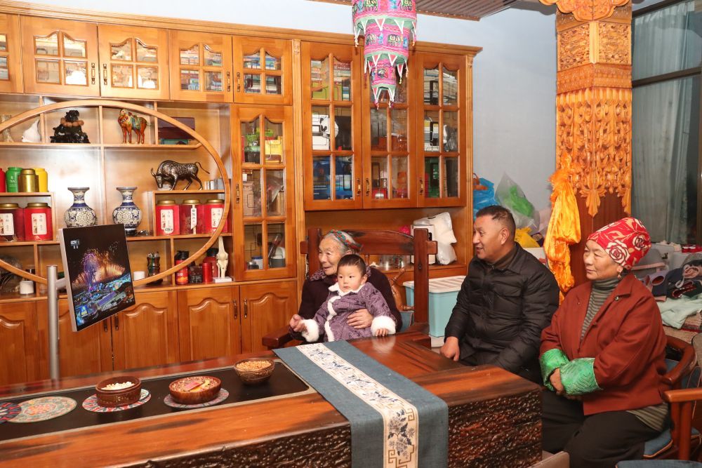 2025年12月31日,陈明英(左一)和家人在家中收看习近平总书记发表二〇二六年新年贺词。新华社发(次仁龙布摄)