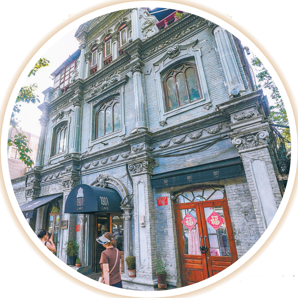 在西安门大街和西皇城根北街的交叉路口,一家名为1901Cafe的咖啡馆开在位于街边北侧的西什库天主教堂配楼。配楼延续了教堂哥特式的建筑风格,里面则是上下三层高挑的砖木结构建筑,配以复古的挂墙电话、打字机、旧报纸,斑驳的墙面上树影婆娑,让人恍如隔世。周末下午,人们或是在坐席间交谈、办公,或是捧着书本,享受惬意的午后时光。