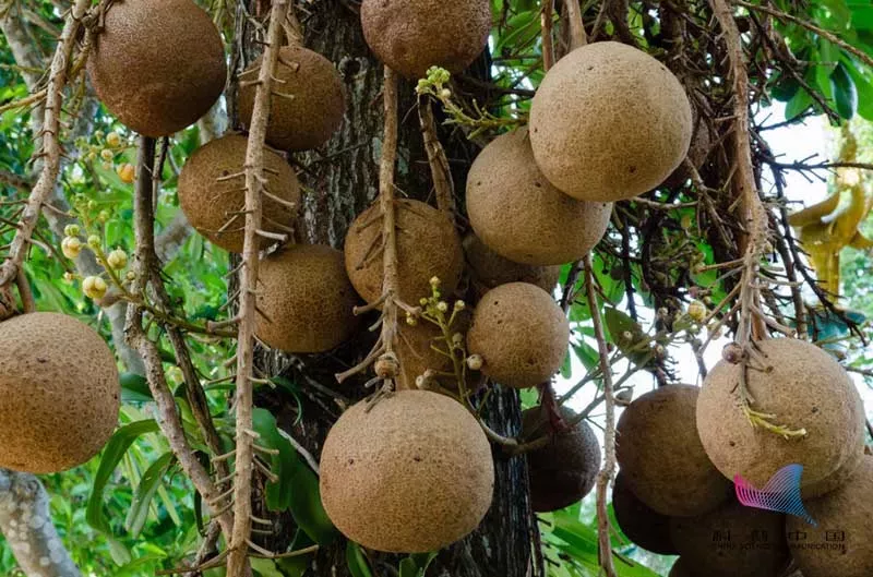 炮弹果来自玉蕊科炮弹树属,原产于中美洲和南美洲的热带雨林,中文名就叫炮弹树,因其美丽、芳香的花朵和大而有趣的果实在世界各地的热带地区种植观赏。果期时,一个个"炮弹"密密地长满在树干上,看上去总像是随时会爆炸一样让人胆战心惊。