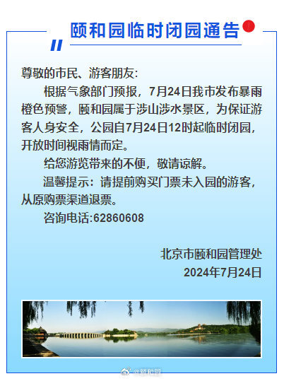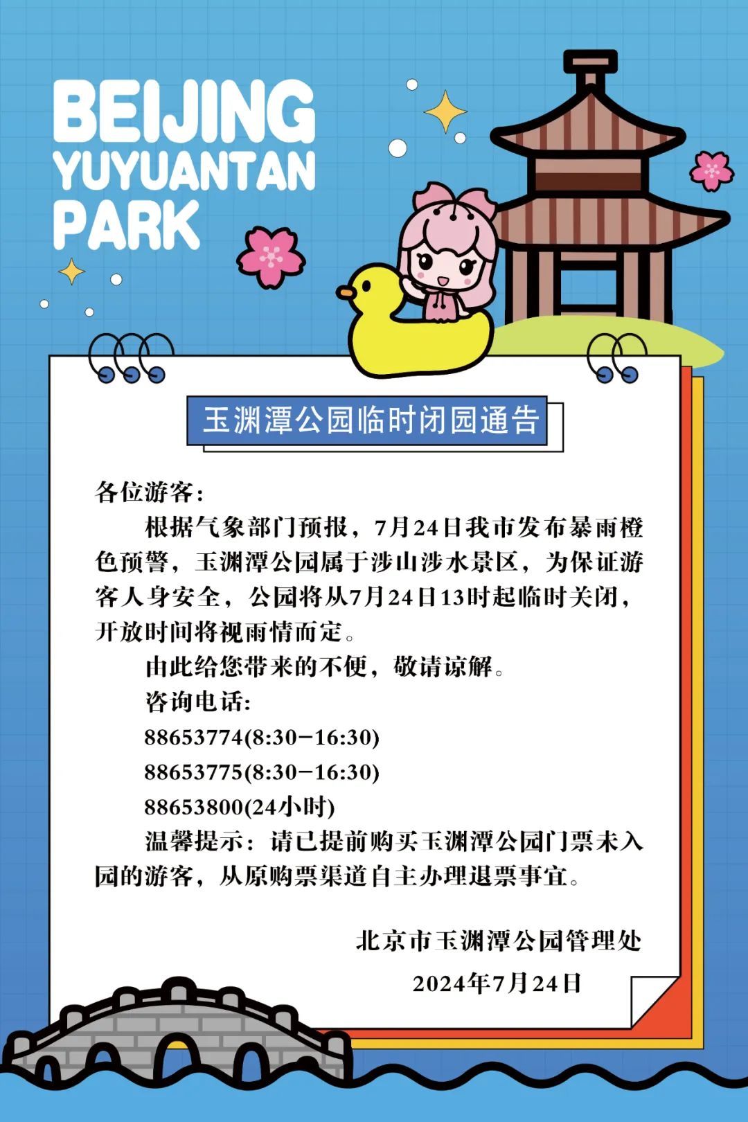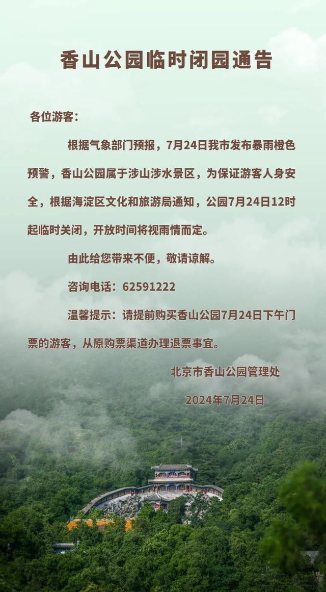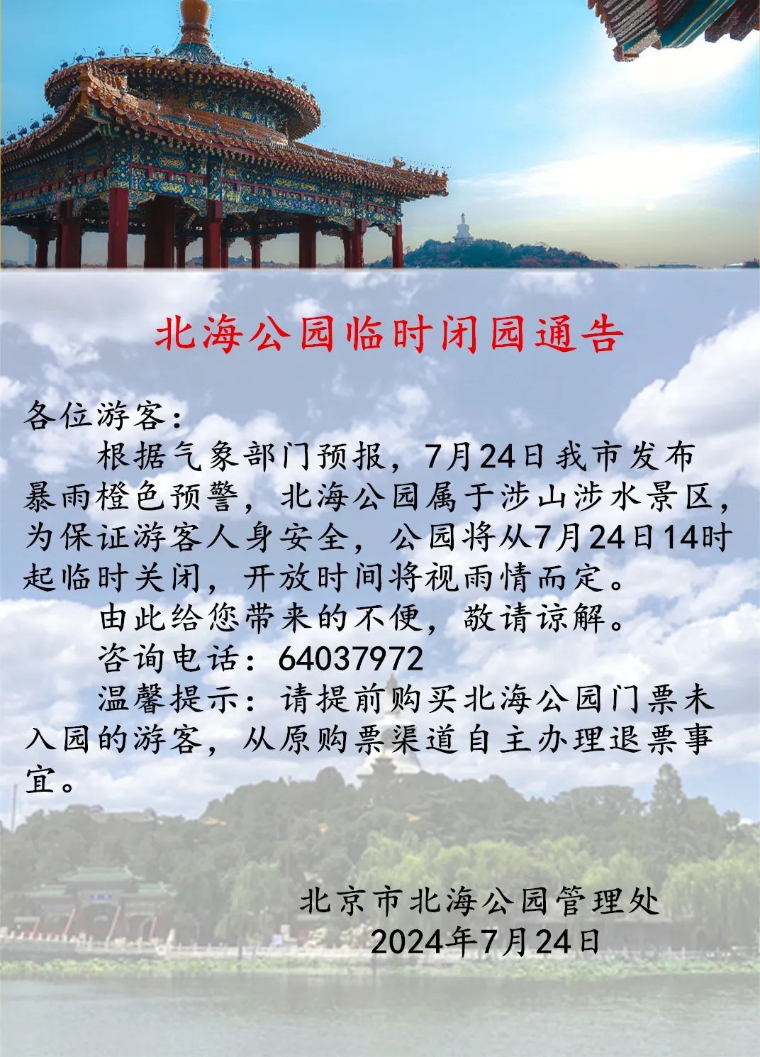 根据气象部门预报,7月24日我市发布暴雨橙色预警,景山公园属于涉山涉水景区,为保证游客人身安全,公园将从7月24日14时起临时关闭,开放时间将视雨情而定。