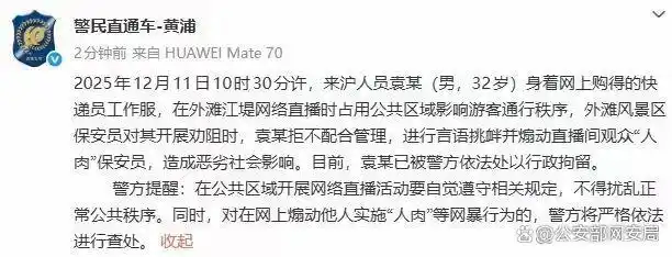 2025年12月11日10时30分许,网民袁某(男,32岁)身着网上购得的快递员工作服,在上海外滩江堤网络直播时占用公共区域影响游客通行秩序,外滩风景区保安员对其开展劝阻时,袁某拒不配合管理,进行言语挑衅并煽动直播间观众“人肉”保安员,造成恶劣社会影响。