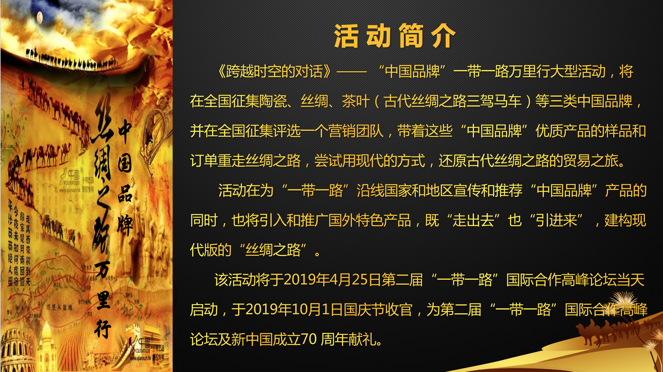 《跨越时空的对话》——“中国品牌”一带一路万里行大型活动,将在全国征集陶瓷、丝绸、茶叶(被称作古代丝绸之路三驾马车)等三类中国品牌,并在全国征集评选一个营销团队,带着这些“中国品牌”优质产品的样品和订单重走丝绸之路,尝试用现代的方式,还原古代丝绸之路的贸易之旅。
