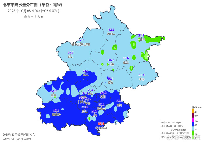 雨水昨早抵京后,持续不停歇。据气象部门统计,从8日4时至9日8时,全市平均降水量46.6毫米,为大雨量级;城区平均53.6毫米,达暴雨量级;全市最大降水量出现在大兴敬贤家园为93.2毫米;最大降水强度也出现在该站,8日21时至22时一小时降水9.2毫米。今天上午,大兴区气象台还发布了暴雨蓝色预警信号。