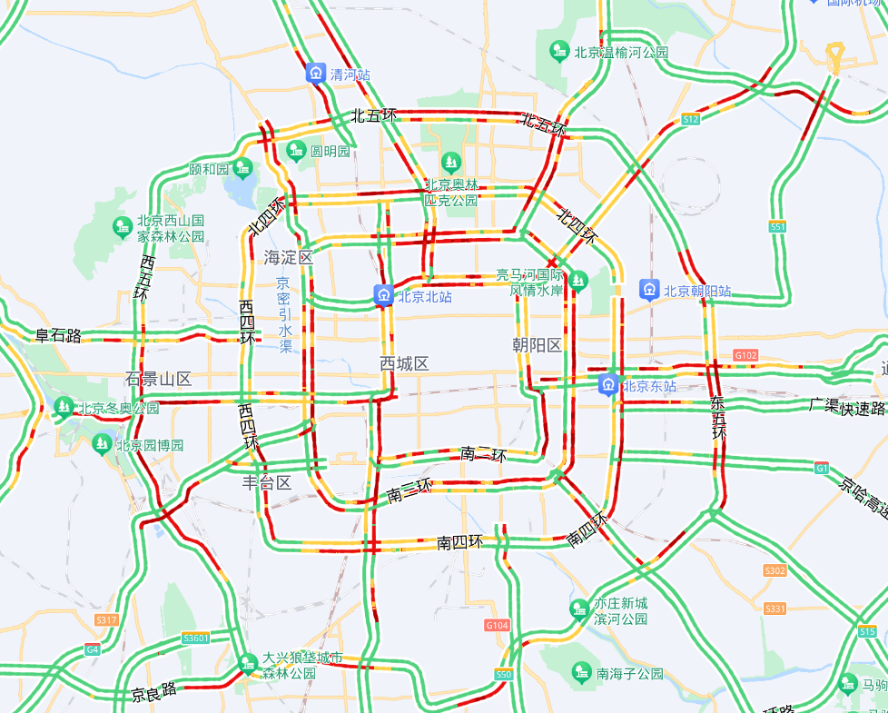早高峰期间,城区东西部环路南向北、北部环路东向西方向,京藏、京承、京开、京港澳等高速公路进城方向易出现行驶缓慢。德胜门、马甸、苏州街、西便门等区域压力较大;阜石路、菜户营南路、西直门北大街、通惠河北路等联络线部分路段车流集中。