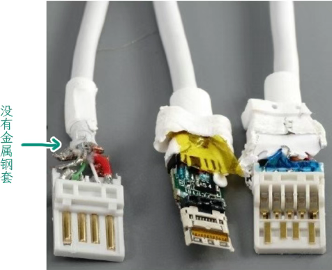 实验人员对一组充电线进行盐雾试验(一种考核产品或金属材料耐腐蚀性能的环境试验),结果显示,优质充电线外观基本无变化,劣质充电线生锈非常严重,内部触点也生出锈斑。由此可见,劣质充电线抗腐蚀性较差。