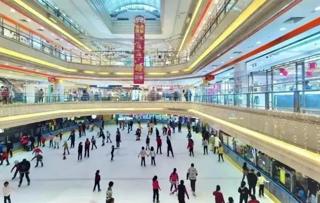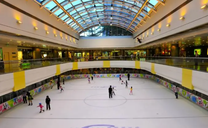 北京首个商场内真冰冰场(1999年开放,老牌地标),冰面800平方米(可容纳150人),冰面恒温17℃;上方为透明玻璃穹顶,白天可仰望蓝天白云,搭配动感音乐,氛围轻松休闲;定期举办冰上嘉年华等特色活动。