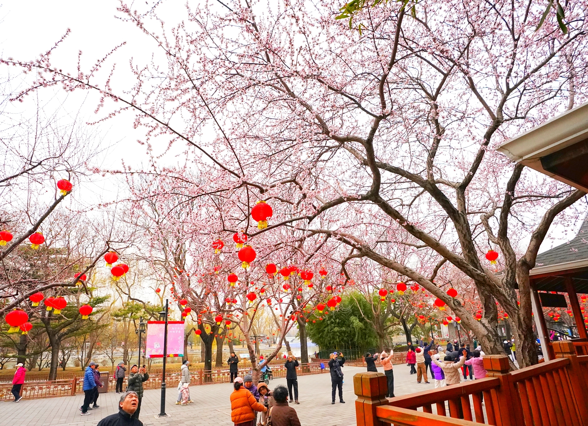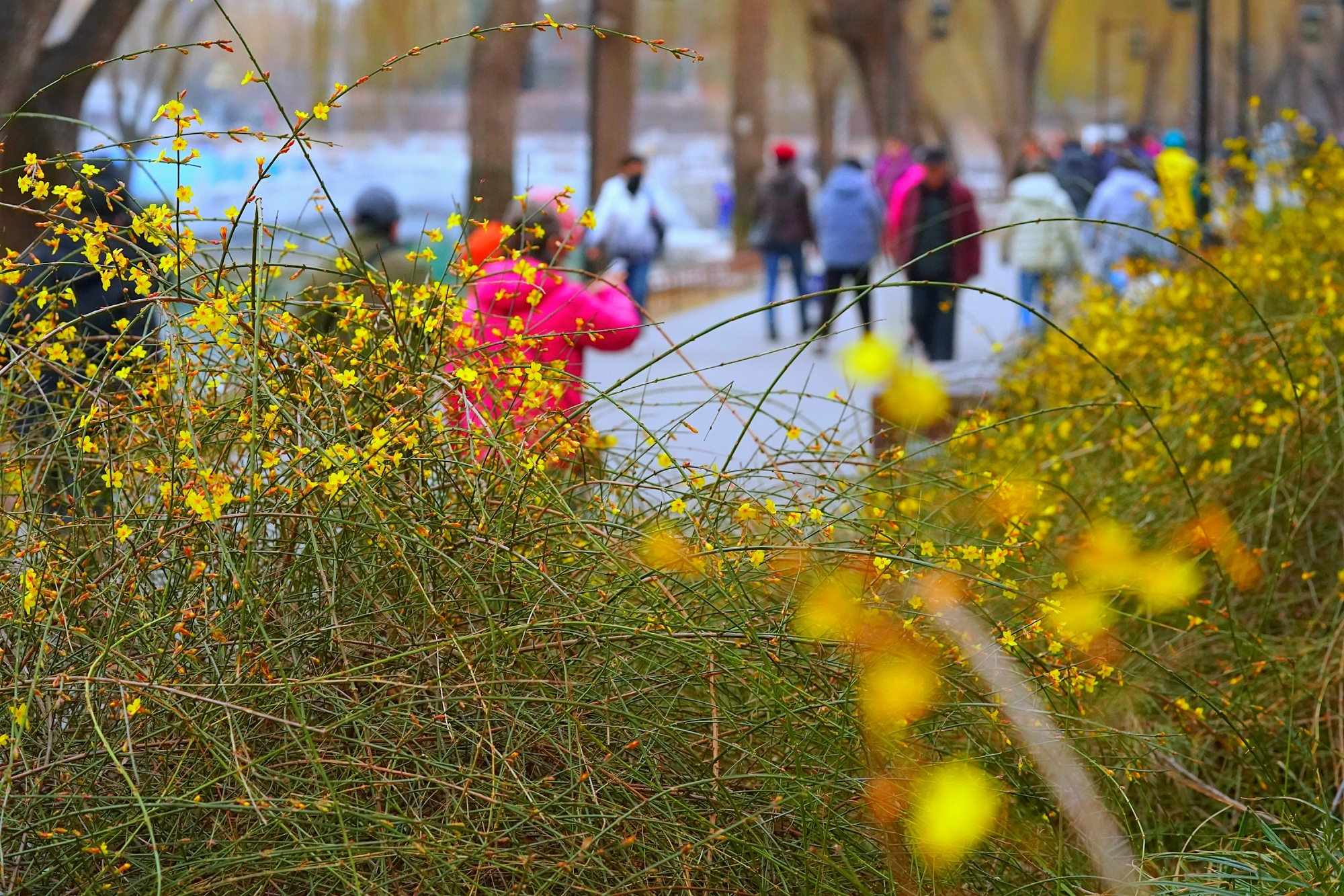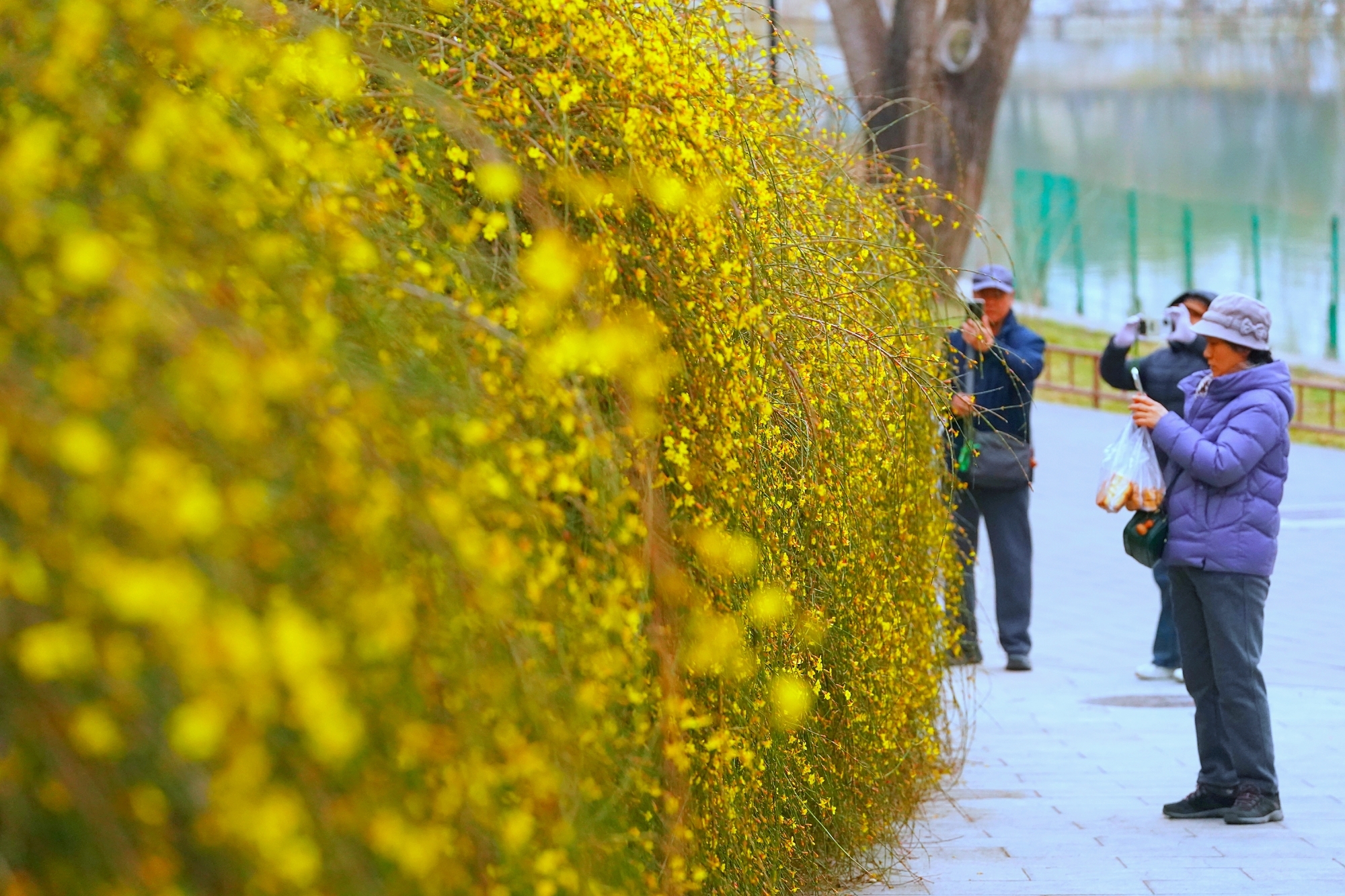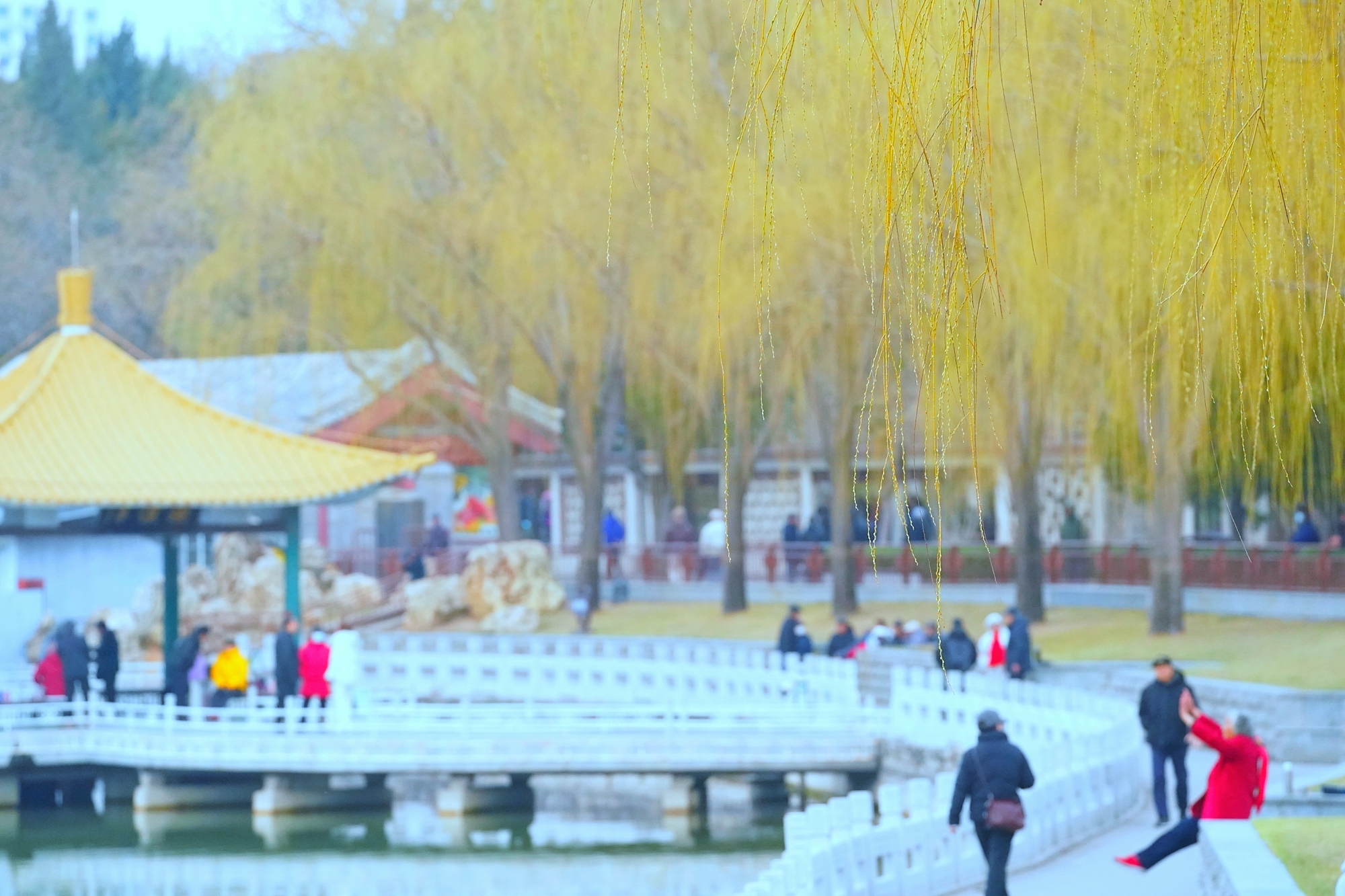 随着气温回暖,陶然亭公园迎来春景。迎春花缀满枝蔓,金黄花海铺就步道,柳丝抽出浅绿,随风拂过湖面,山桃花初绽芳容,粉花配红灯笼,年味未散春意更浓。
