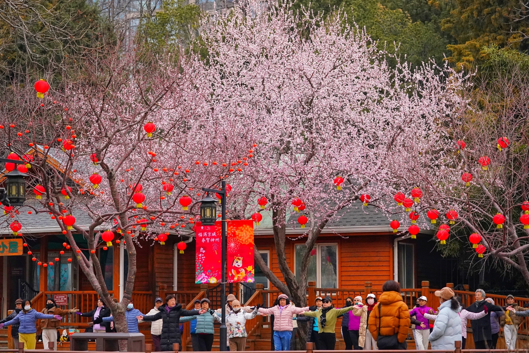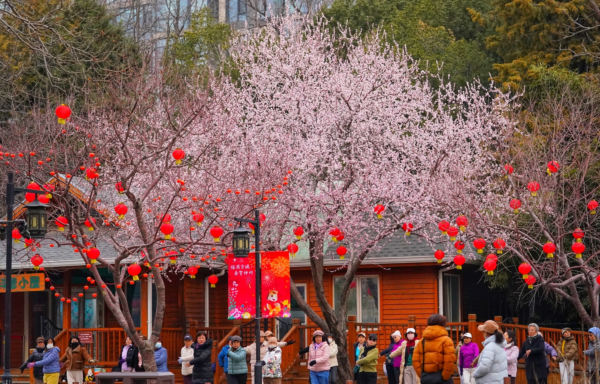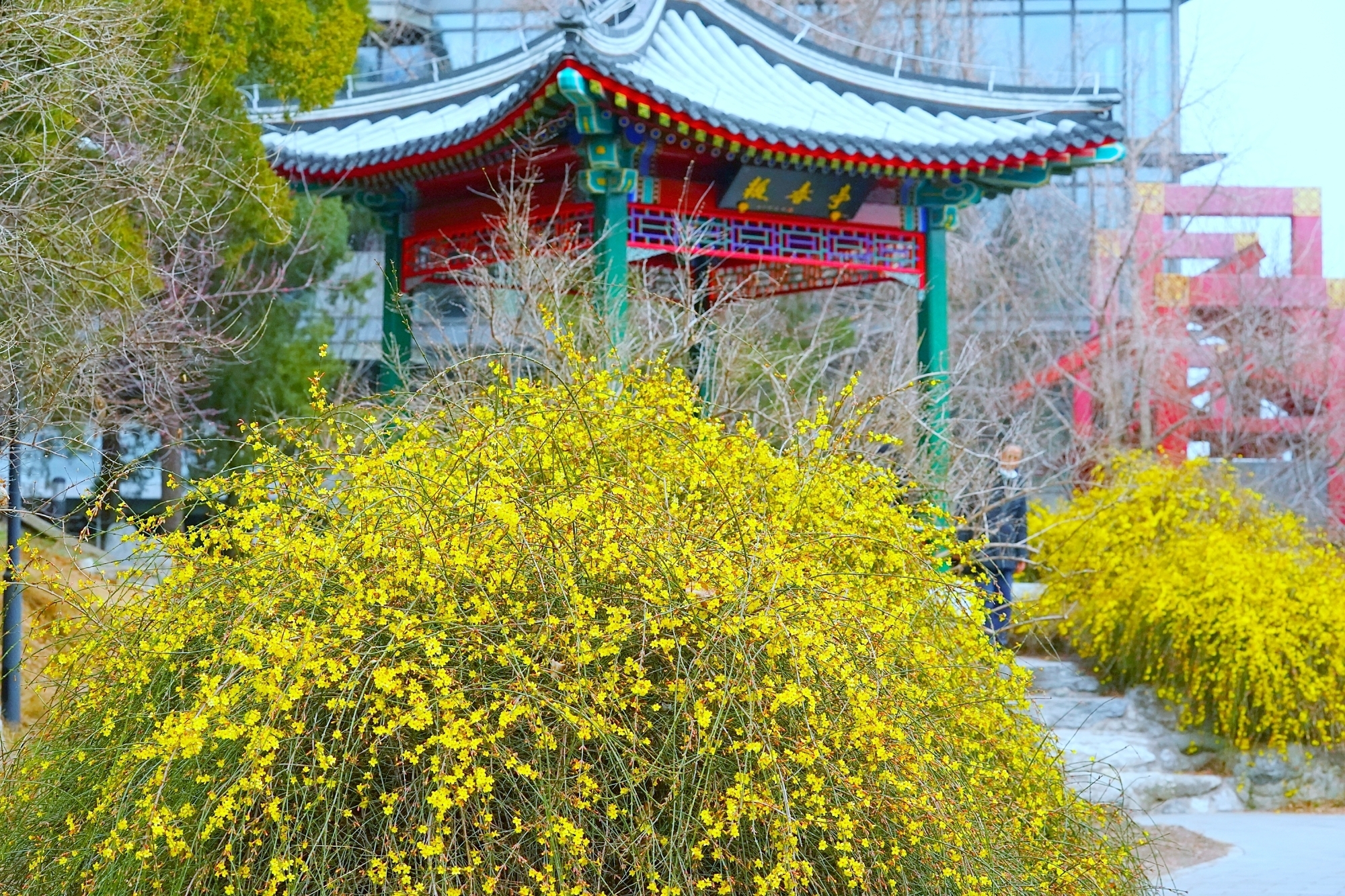 随着气温回暖,陶然亭公园迎来春景。迎春花缀满枝蔓,金黄花海铺就步道,柳丝抽出浅绿,随风拂过湖面,山桃花初绽芳容,粉花配红灯笼,年味未散春意更浓。