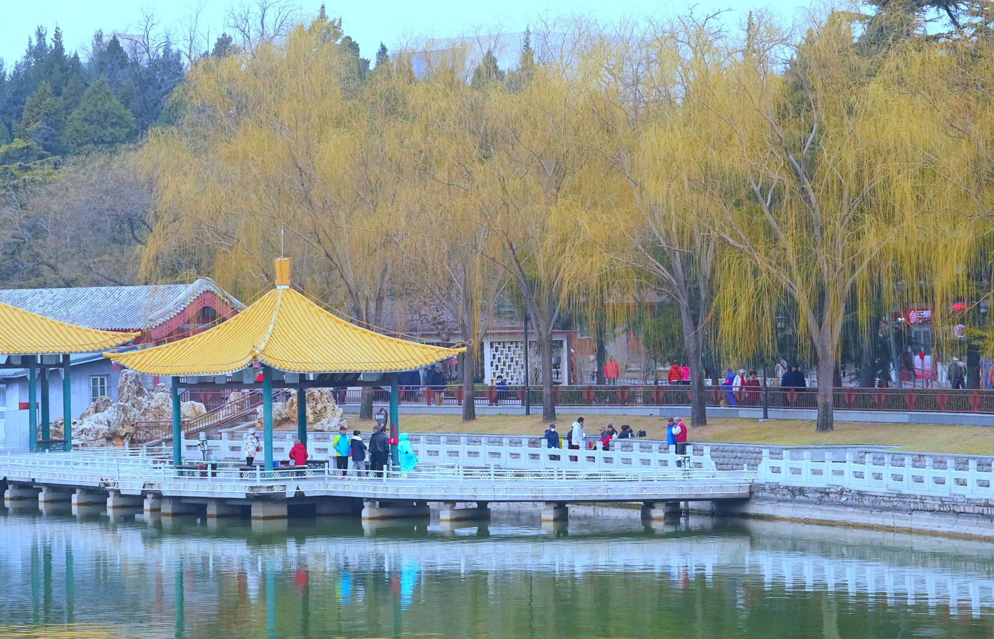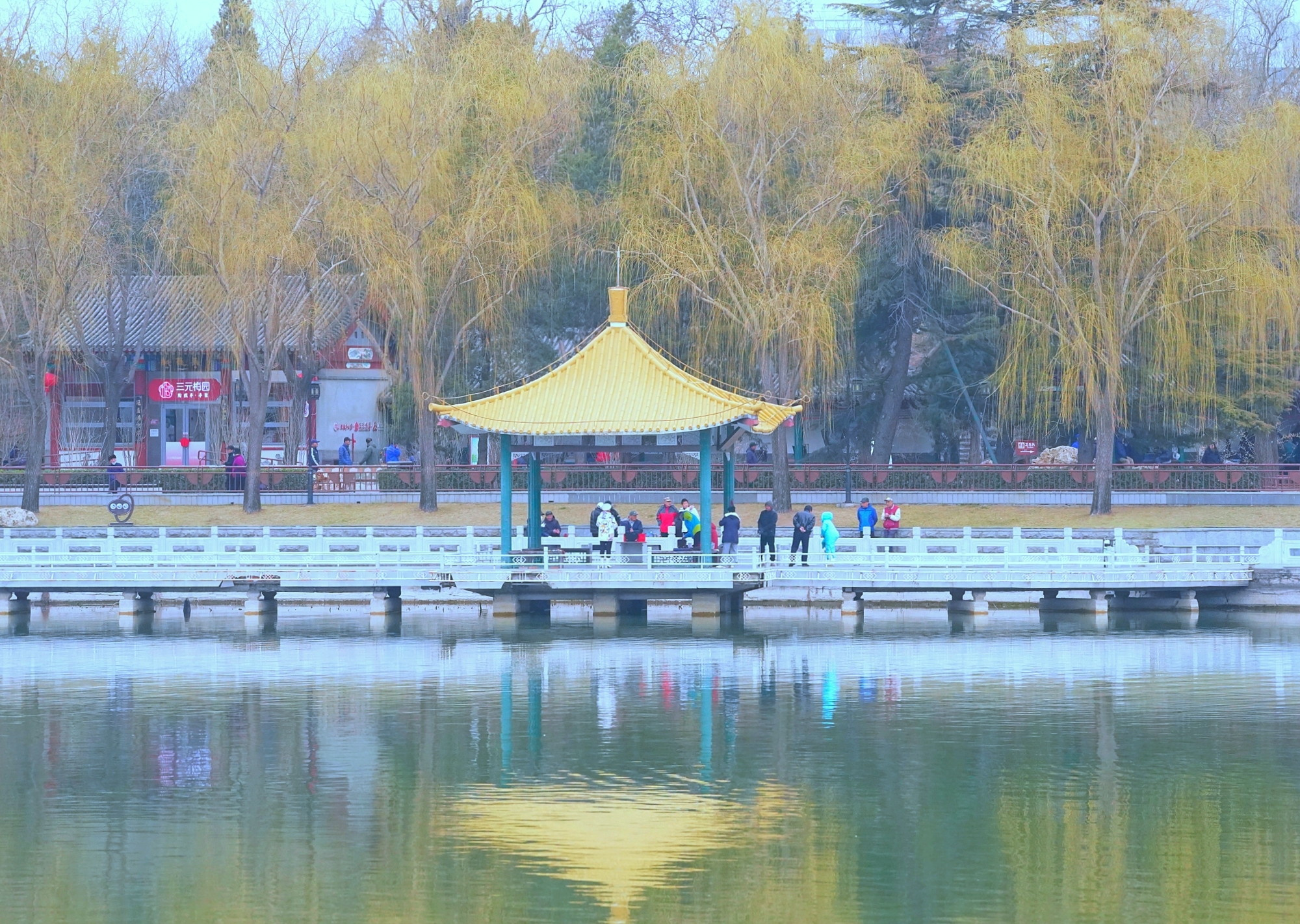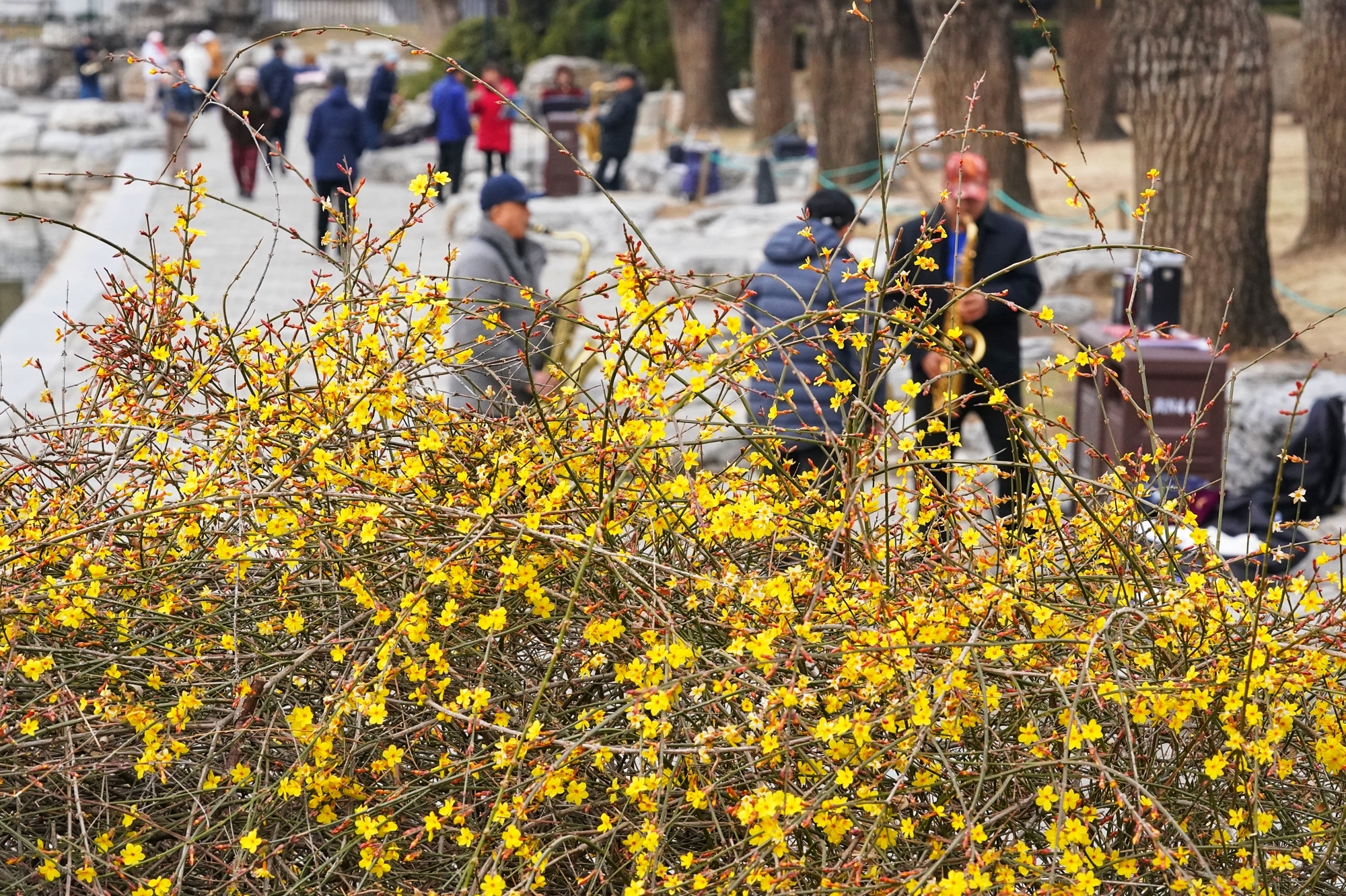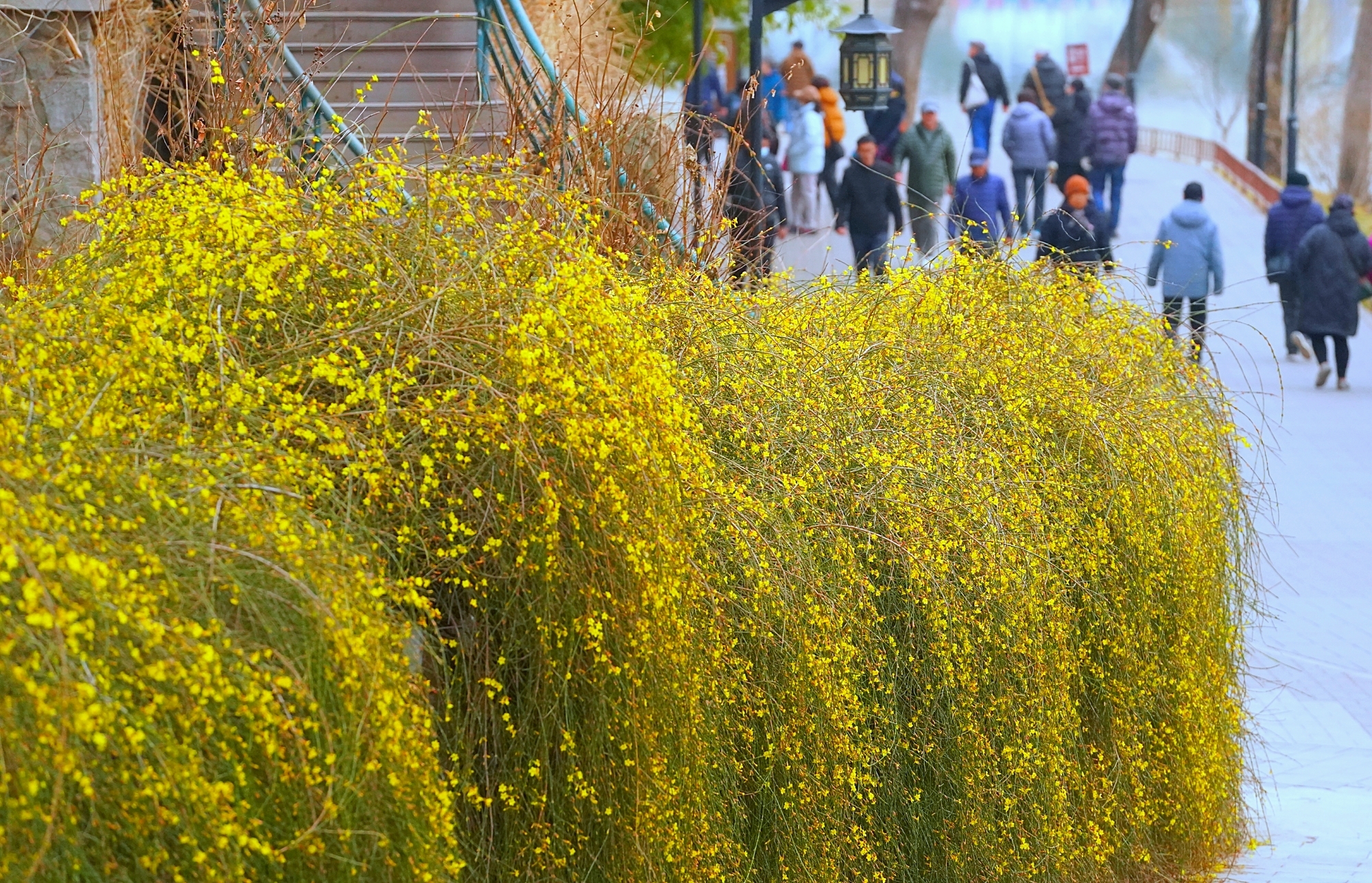 随着气温回暖,陶然亭公园迎来春景。迎春花缀满枝蔓,金黄花海铺就步道,柳丝抽出浅绿,随风拂过湖面,山桃花初绽芳容,粉花配红灯笼,年味未散春意更浓。
