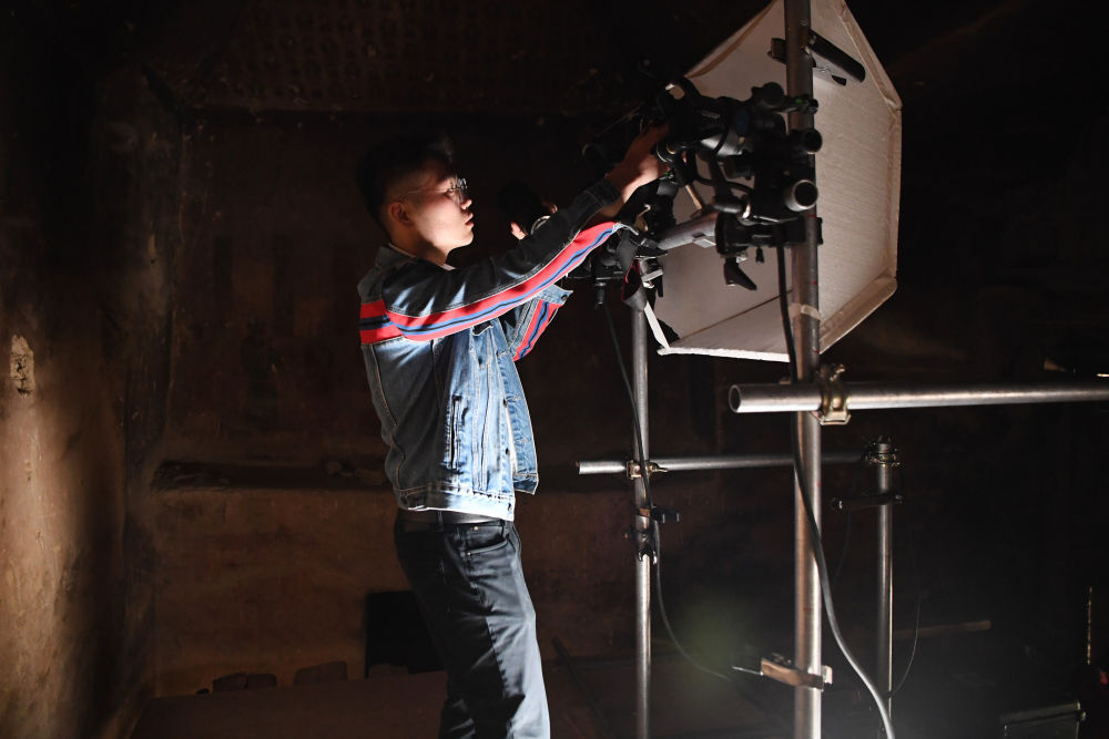 敦煌研究院文物数字化保护团队图像采集人员熊业腾在洞窟内调试设备,准备进行壁画图像采集(4月25日摄)。