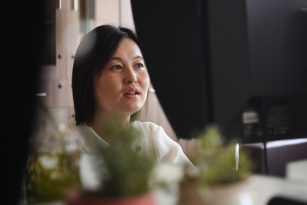 敦煌研究院文物数字化保护团队图像处理人员年海丽在拼接壁画图像(4月25日摄)。