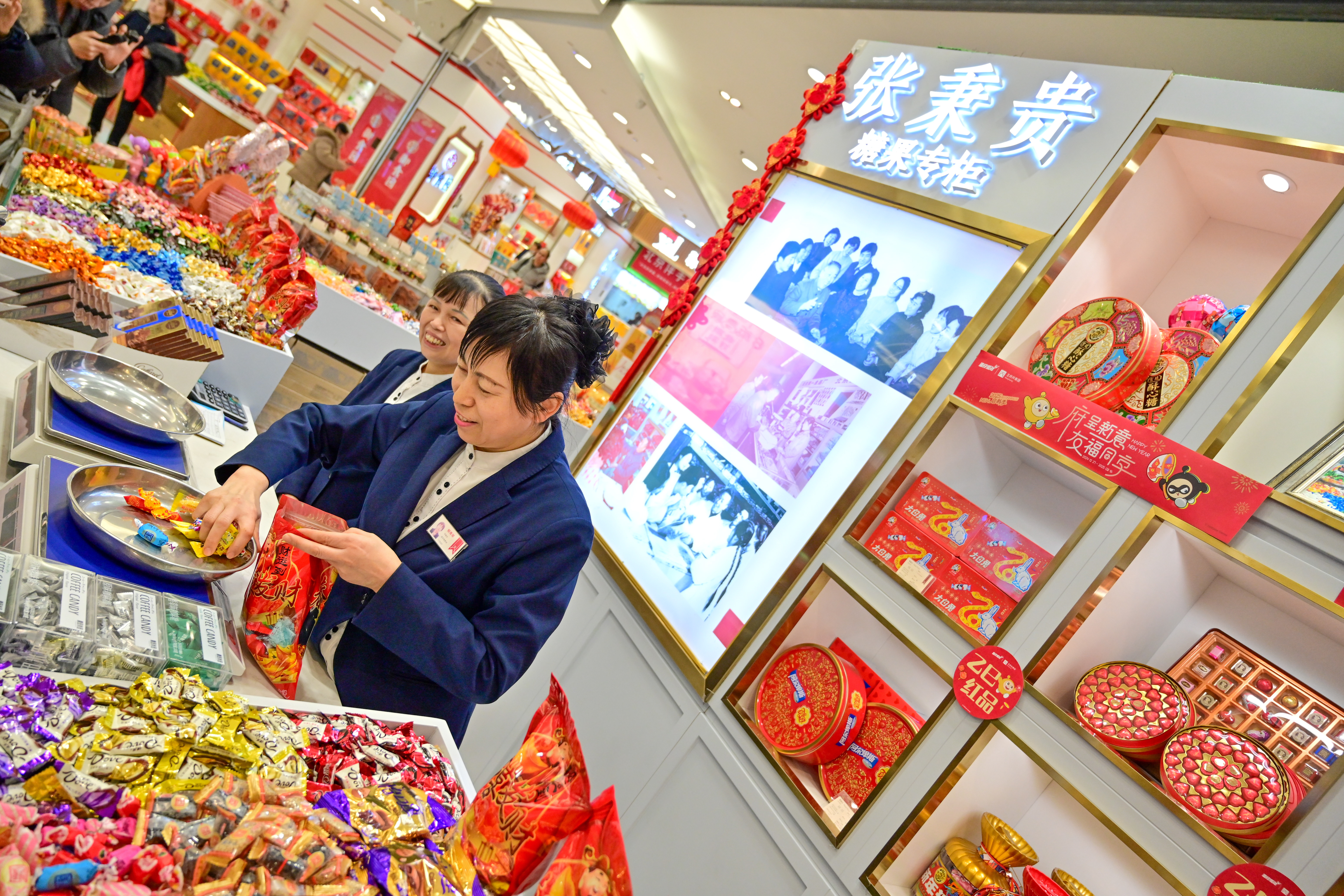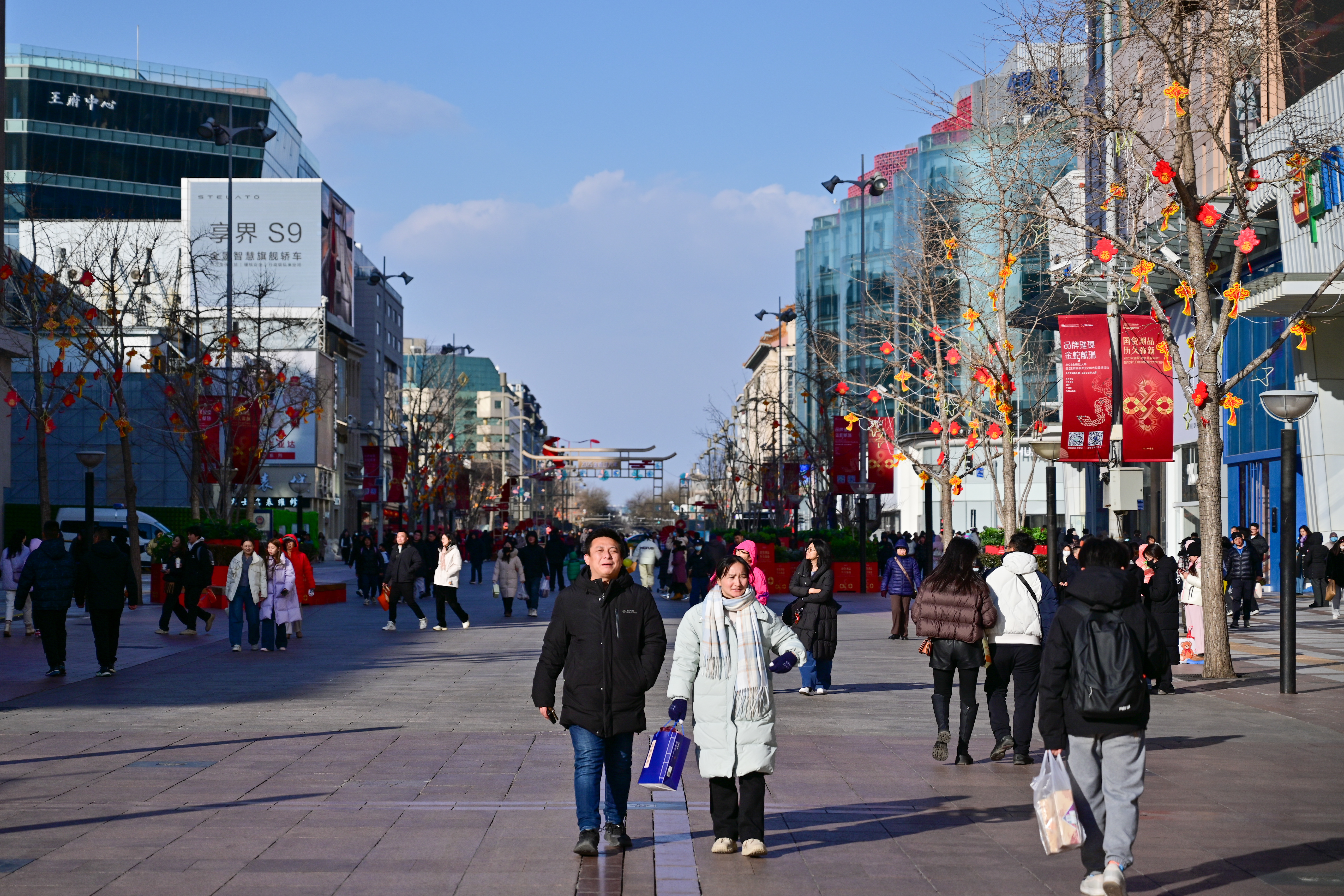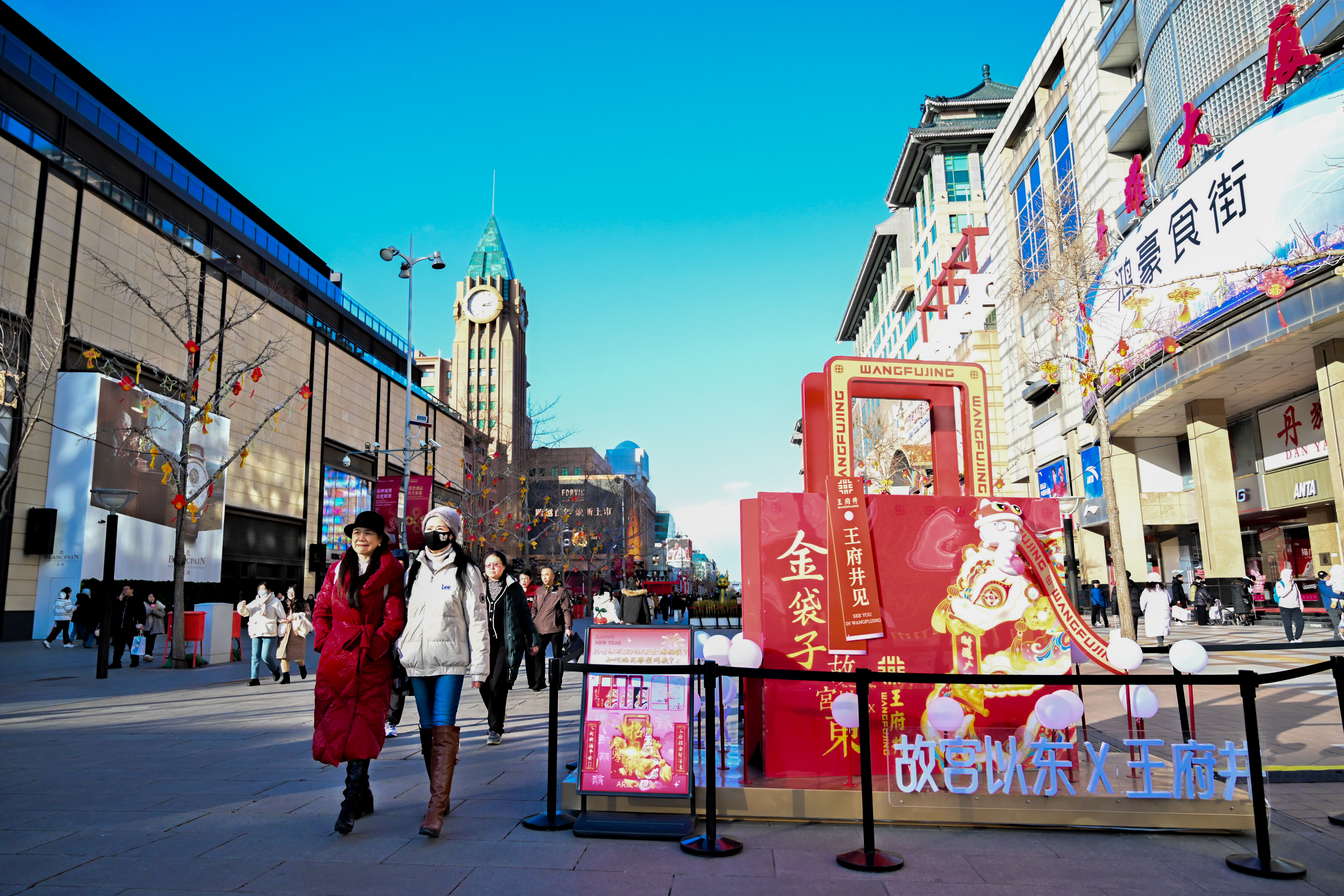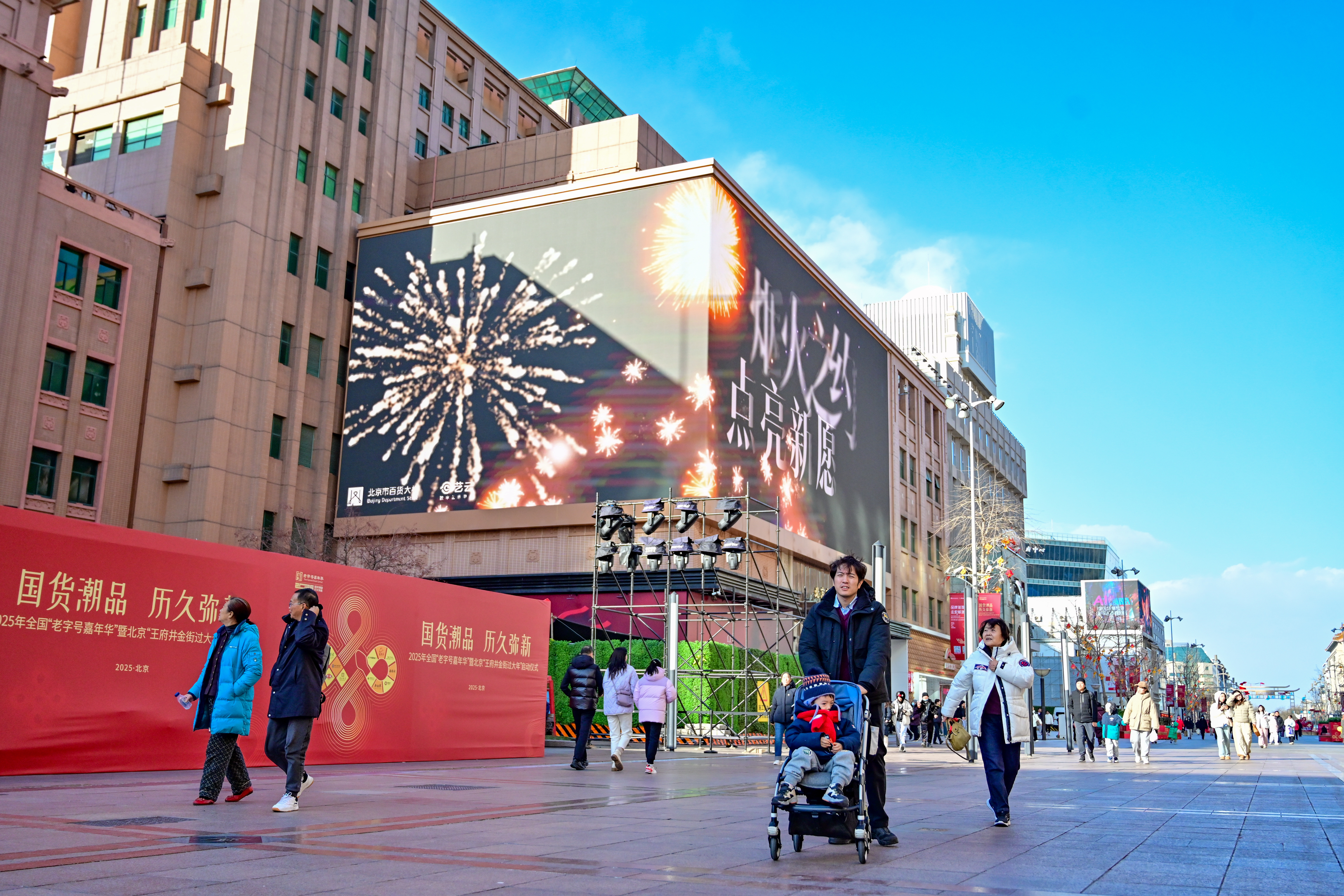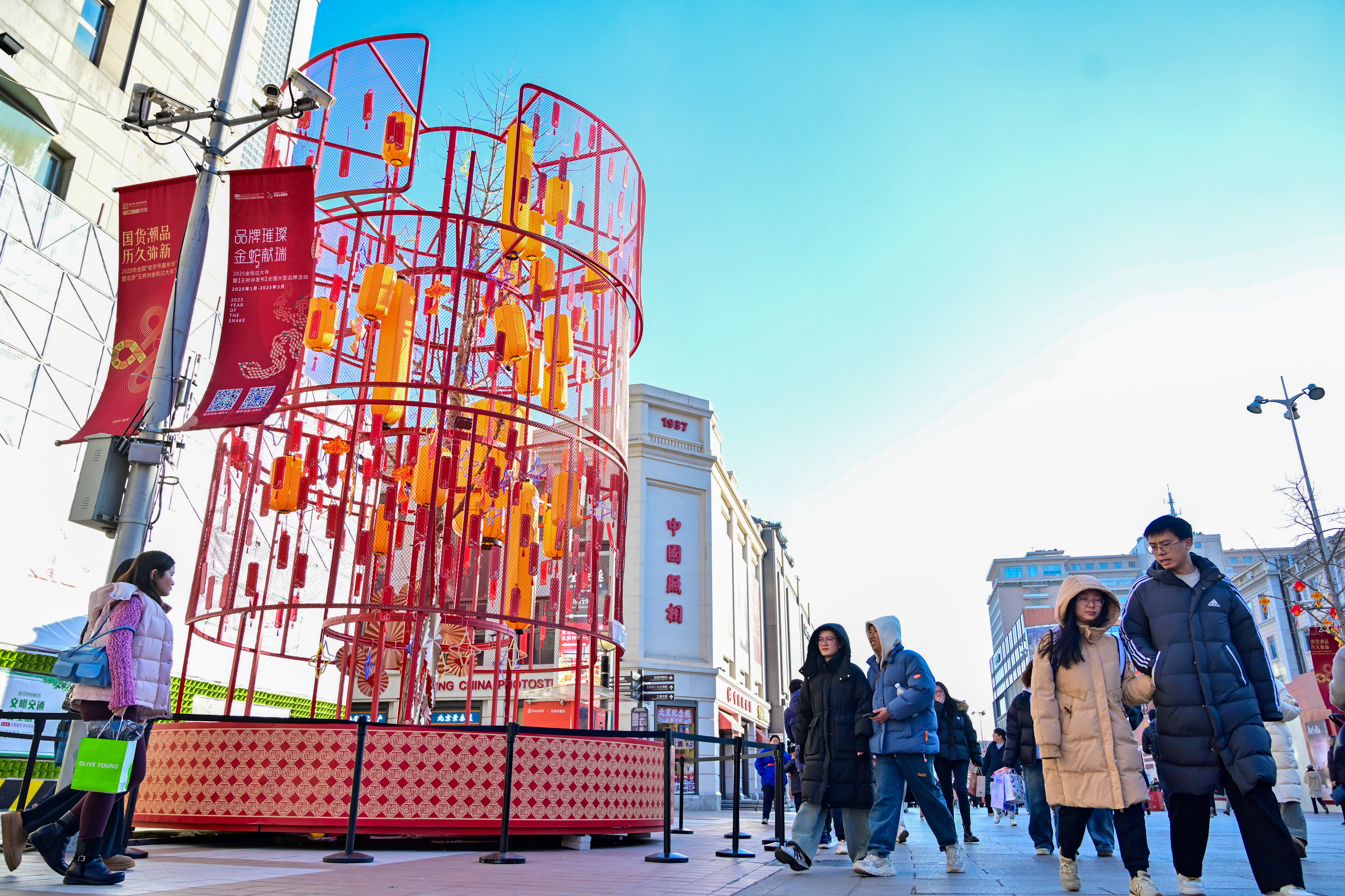 春节临近,王府井步行街上,喜庆的装饰陆续“上新”。众多市民游客来此购买老字号点心、糖果等丰富的年货。