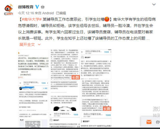网帖称,南华大学衡阳医学院18级辅导员周某工作态度极其恶劣,多名疑似学生的人发文称遭遇其粗暴对待。如,学生A祖母病危找其病假被拒绝,结果第二天A的祖母病逝,A哭着再次找其请假,哭着说“你昨天不给我批假,我连我奶奶的最后一面都没见到!”方才获批。然而,周某却在之后开团干学生会议时用此事举例教育学生:“你们在任何时候都要保持冷静,不要像这个人一样,一进门就哭,说她奶奶已经去世了。我什么情况都不了解,我怎么为你批假?而且你们要明白,在这里没有任何人必须为她批假。”