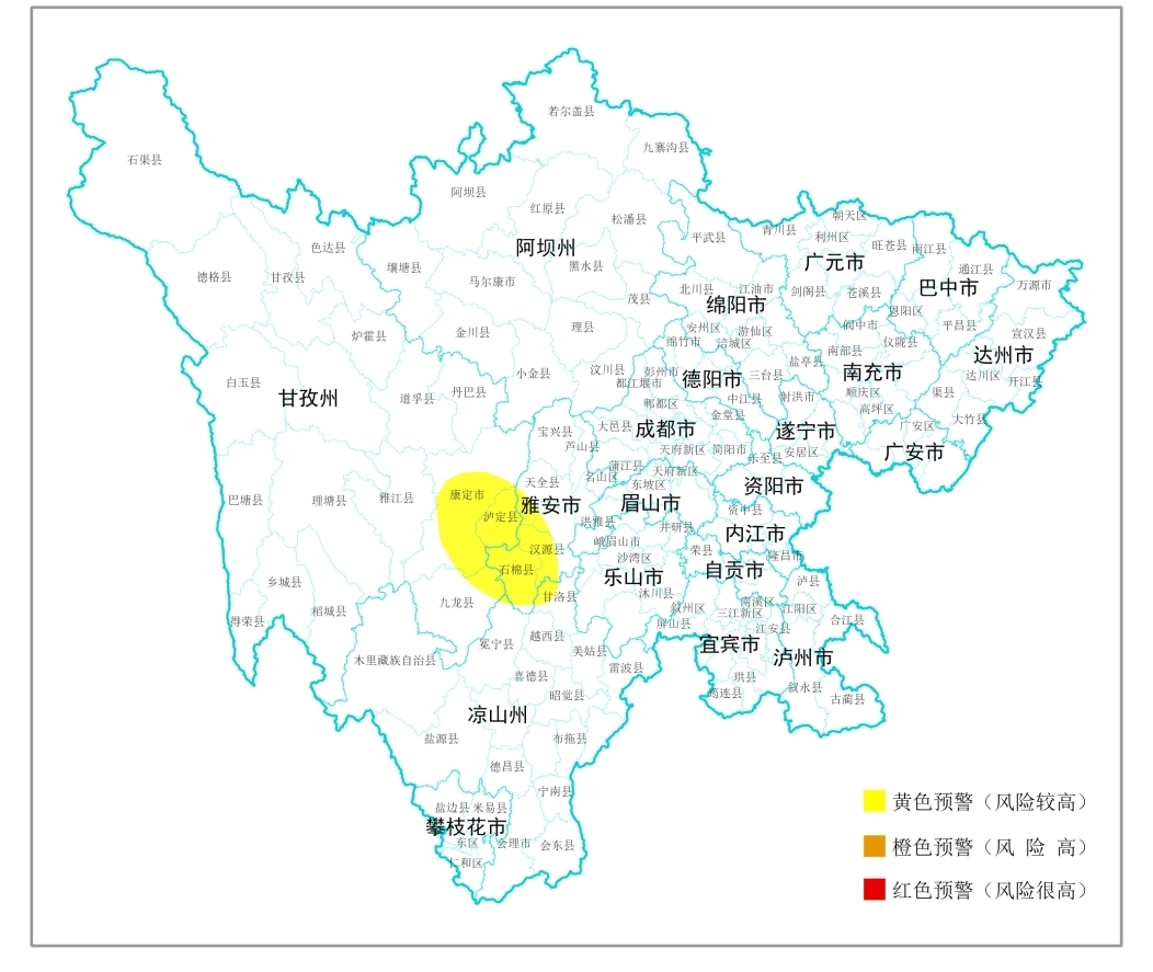 四川省甘孜州泸定县发生6.8级地震。根据地震震级与影响场烈度,结合四川省气象台天气预报情况,预计未来72小时,甘孜州康定市、泸定县、九龙县、雅江县,雅安市天全县、荥经县、汉源县、石棉县,凉山州冕宁县、甘洛县等3市(州)10县(市)发生地质灾害的风险较高(黄色预警)。