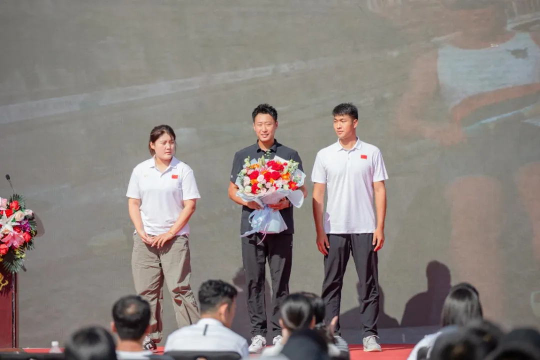 在2024年全国中学生田径锦标赛中获奖并打破全国记录的原初三年级运动员刘继、张宇涵、彭玉森、尹铭丞、叶俊熙相继上台,他们五个人牺牲了参加自己高中开学典礼的机会,回到母校与大家分享他们的奋斗故事,以梦为马,奋斗拼搏,为学弟学妹们树立了光辉的榜样。