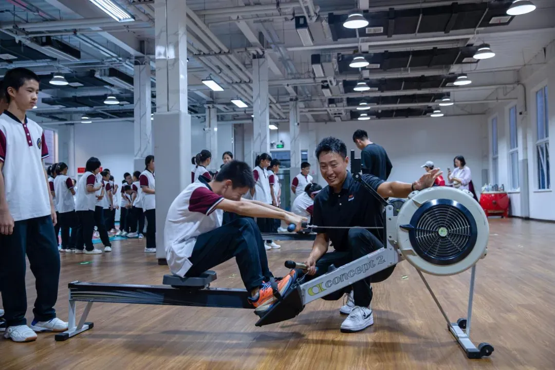 三届中国陆上赛艇冠军王佳旭携其团队也与学生们开展了一场别开生面的互动活动。王佳旭亲自示范划船器使用技巧,并引导学生们亲身体验,耐心纠正动作,传授专业知识。随后的1100米划船接力赛更是将现场气氛推向高潮,初一3班的学生们最终夺得桂冠。活动中,学生们深切感受到运动员的刻苦训练与拼搏精神,纷纷表示要以冠军为榜样,在学习生活中同样勇于挑战、坚持不懈。此次活动不仅让学生们享受到了运动的乐趣,更激发了他们追求卓越、永不言弃的斗志。