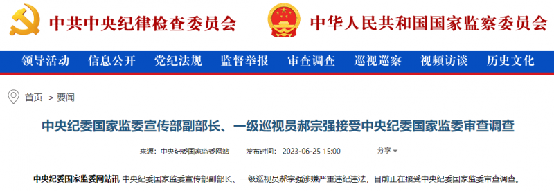 中央纪委国家监委网站讯 中央纪委国家监委宣传部副部长、一级巡视员郝宗强涉嫌严重违纪违法,目前正在接受中央纪委国家监委审查调查。