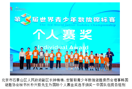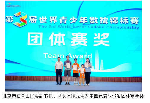 2025年8月23日晚,第三届世界青少年数独锦标赛在北京市石景山区万达嘉华酒店落下帷幕。来自美国、日本、韩国、中国、中国香港等8个国家和地区的200多名青少年数独选手参赛。北京市石景山区委副书记、区长万隆,北京市石景山区人民政府副区长钟棉棉,世智联青少年数独谜题委员会理事韩国谜题协会秘书长朴兴哲,北京歌华传媒集团党委副书记、董事祁永清,北京奥运城市发展基金会理事长李拥军,以及北京市石景山区文化和旅游局、北京市石景山区体育局等主承办单位的领导、数独领域专家及来自美国、日本、韩国、中国、中国香港等8个国家和地区的200多名青少年选手出席闭幕式。