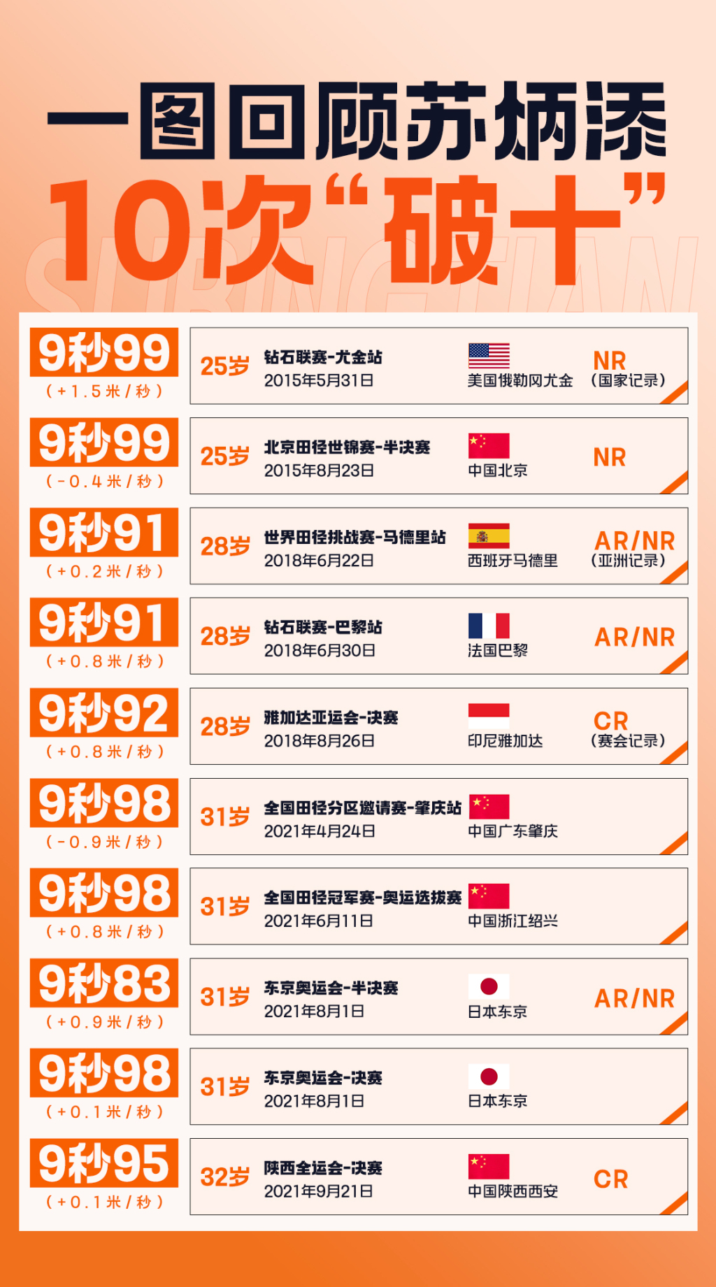 从2015年世界田联钻石联赛尤金站的9秒99开始,苏炳添正式将中国百米国家纪录导入10秒以内;2018年从马德里到巴黎,苏炳添两次跑出9秒91,追平亚洲纪录;此后再经历三年积淀,“苏神”在东京奥运会彻底爆发,用9秒83改写亚洲纪录;而那一年的陕西全运会,他在决赛中的9秒95,最后一次“破十”并夺冠,为“苏神”的故事画上惊叹号。