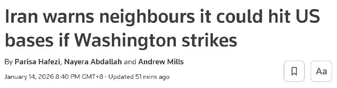“伊朗方面已向沙特阿拉伯、阿联酋、土耳其等地区国家告知,若美国将伊朗列为打击目标,部署在这些国家境内的美军基地都将遭到袭击”,该官员对路透社说。