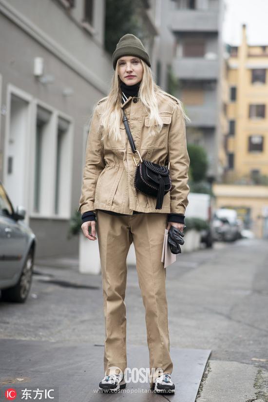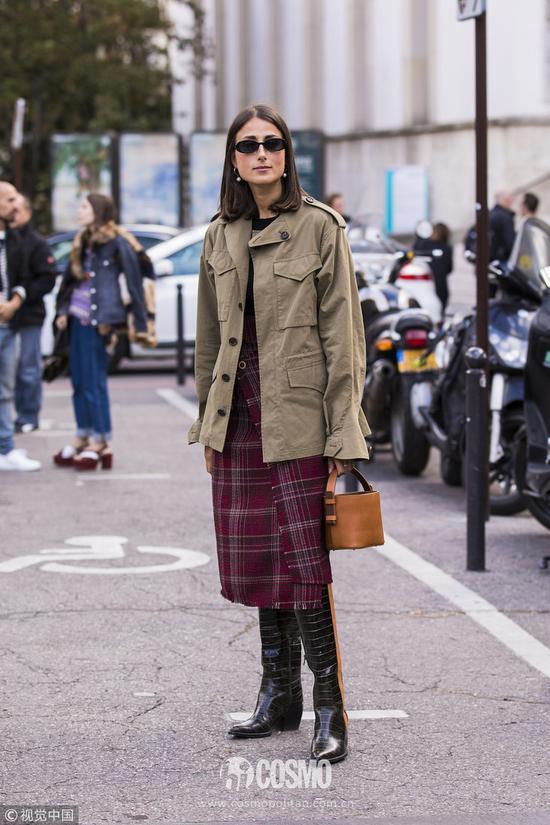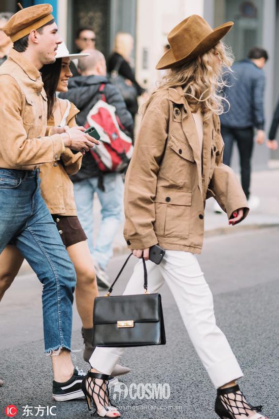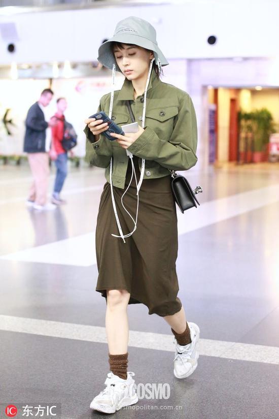 短款的工装外套也很受时髦精们的喜爱。比如王子文这款军绿色夹克工装外套就很利落帅气,她下身搭配同色系墨绿色半身裙,非常Chic。头戴白色飘带渔夫帽,可爱满分。