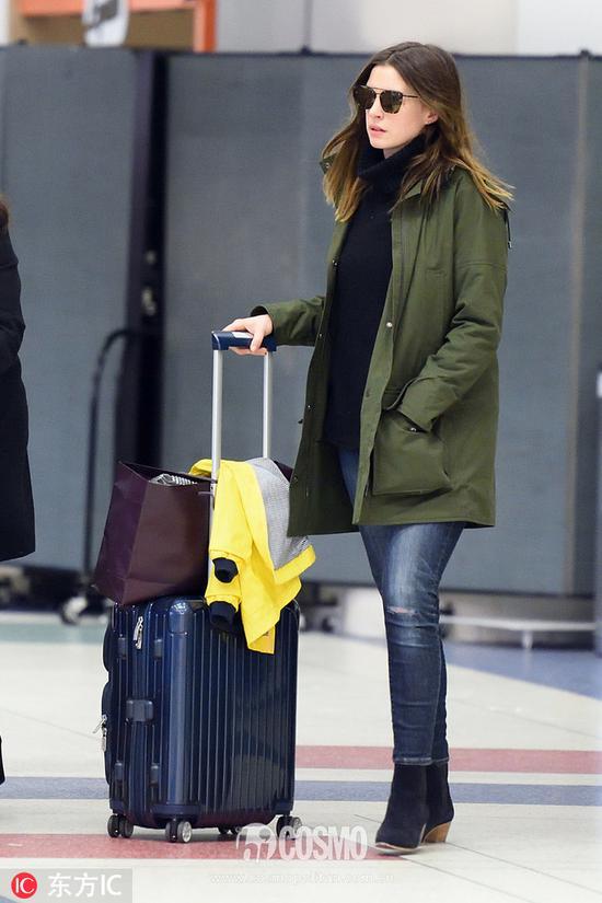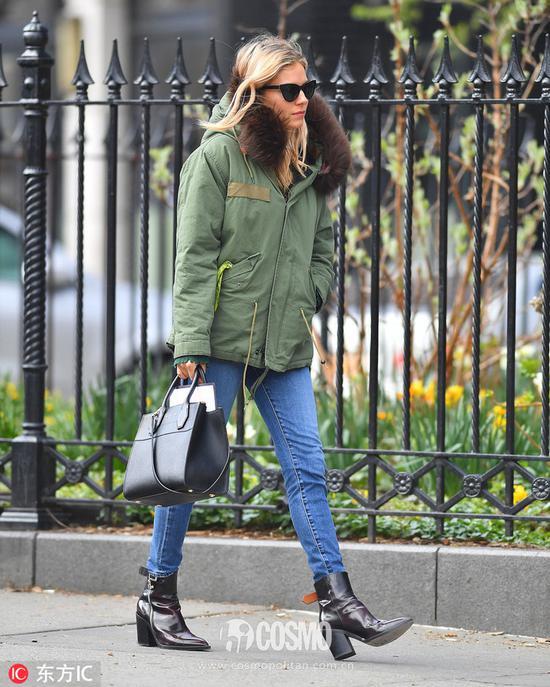 西耶那-米勒(Sienna Miller)用军绿色毛绒工装大衣搭配蓝色牛仔裤,温暖舒适。脚踩的酒红色方头短靴非常亮眼,给整体造型加了不少分。