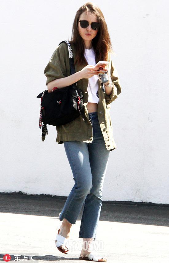 莉莉-柯林斯(Lily Collins)身穿军绿色工装外套内搭白色露脐Tee,整体LOOK随性简约。下身搭配不规则牛仔裤和白色拖鞋,是非常休闲的穿搭了。