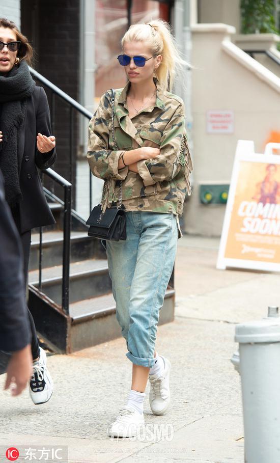 哈利-克劳森(Hailey Clauson)也曾身穿迷彩工装衬衫出街,搭配直筒牛仔裤和白色运动鞋,十分舒适的穿搭风格。