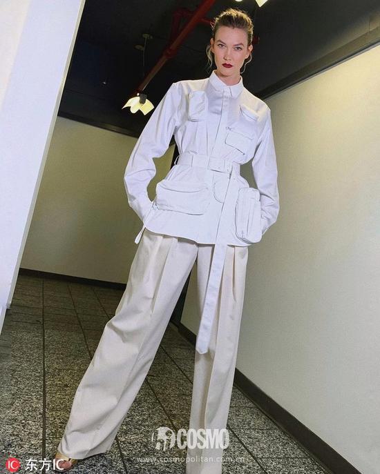 卡莉-克劳斯(Karlie Kloss)身穿Louis Vuitton纯白色工装衬衫,搭配米色阔腿长裤。逆天的大长腿,酷劲十足。