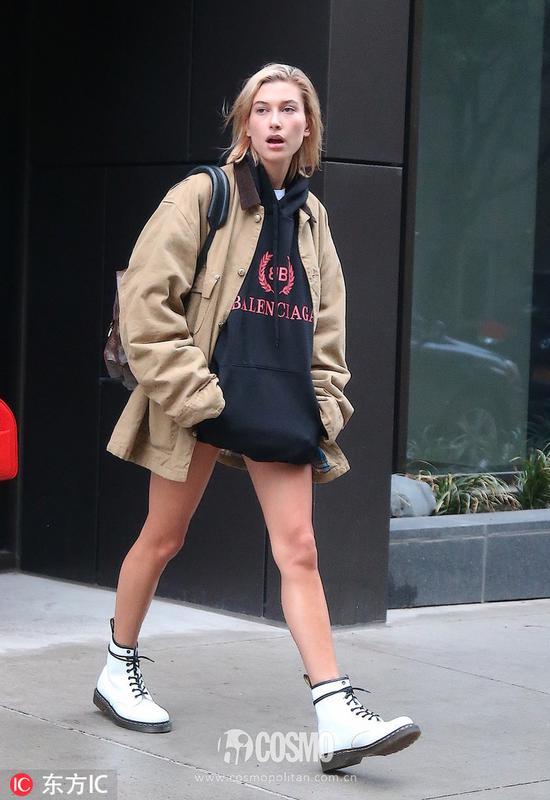 海狸内搭Balenciaga logo黑色连帽卫衣,一样轻松驾驭这种帅气休闲的穿搭风格。
