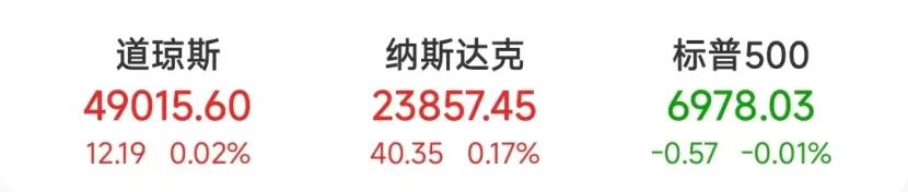 具体来看,截至收盘,道指涨12.19点,涨幅为0.02%,报49015.60点;纳指涨40.35点,涨幅为0.17%,报23857.45点;标普500指数跌0.57点,跌幅为0.01%,报6978.03点。
