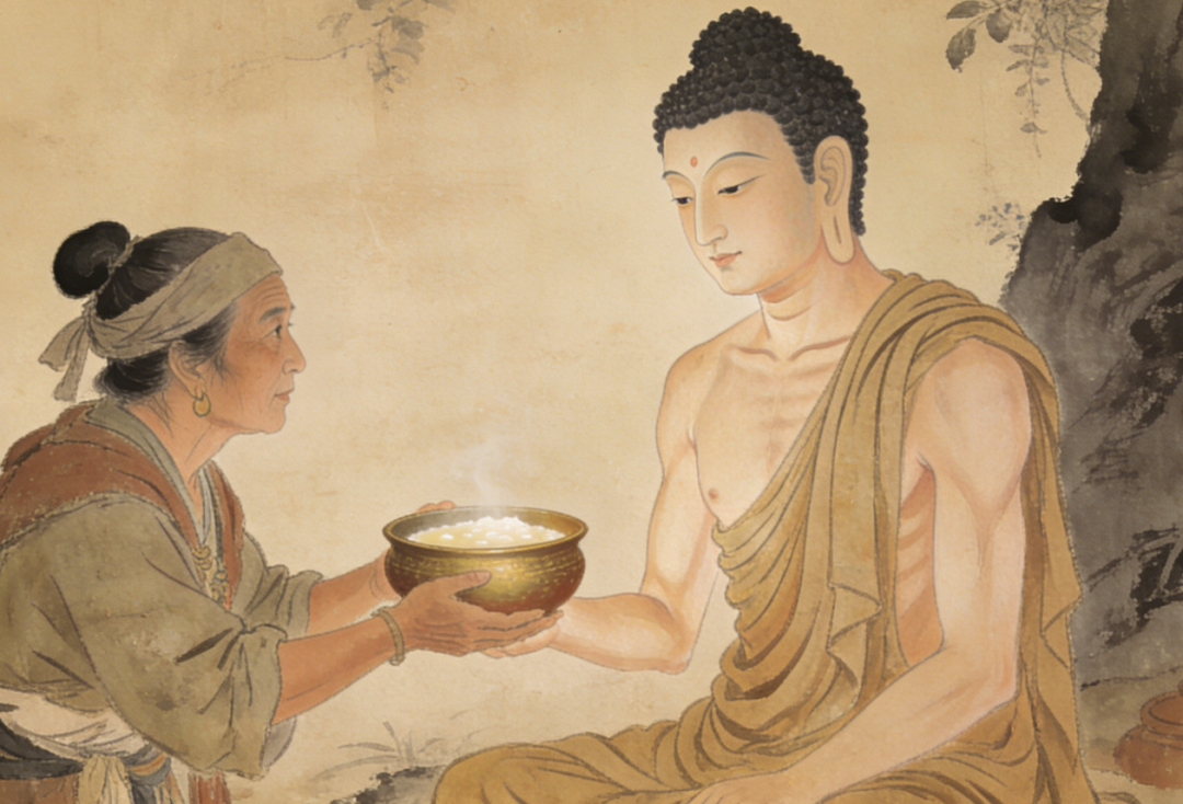 途中一位牧女见他虚弱不堪,以乳糜(奶与谷物熬成的粥)供养。他饮后体力逐渐恢复,随后在菩提树下静坐入定,并于腊月初八之夜,仰望明星而豁然悟道,成就无上正觉。