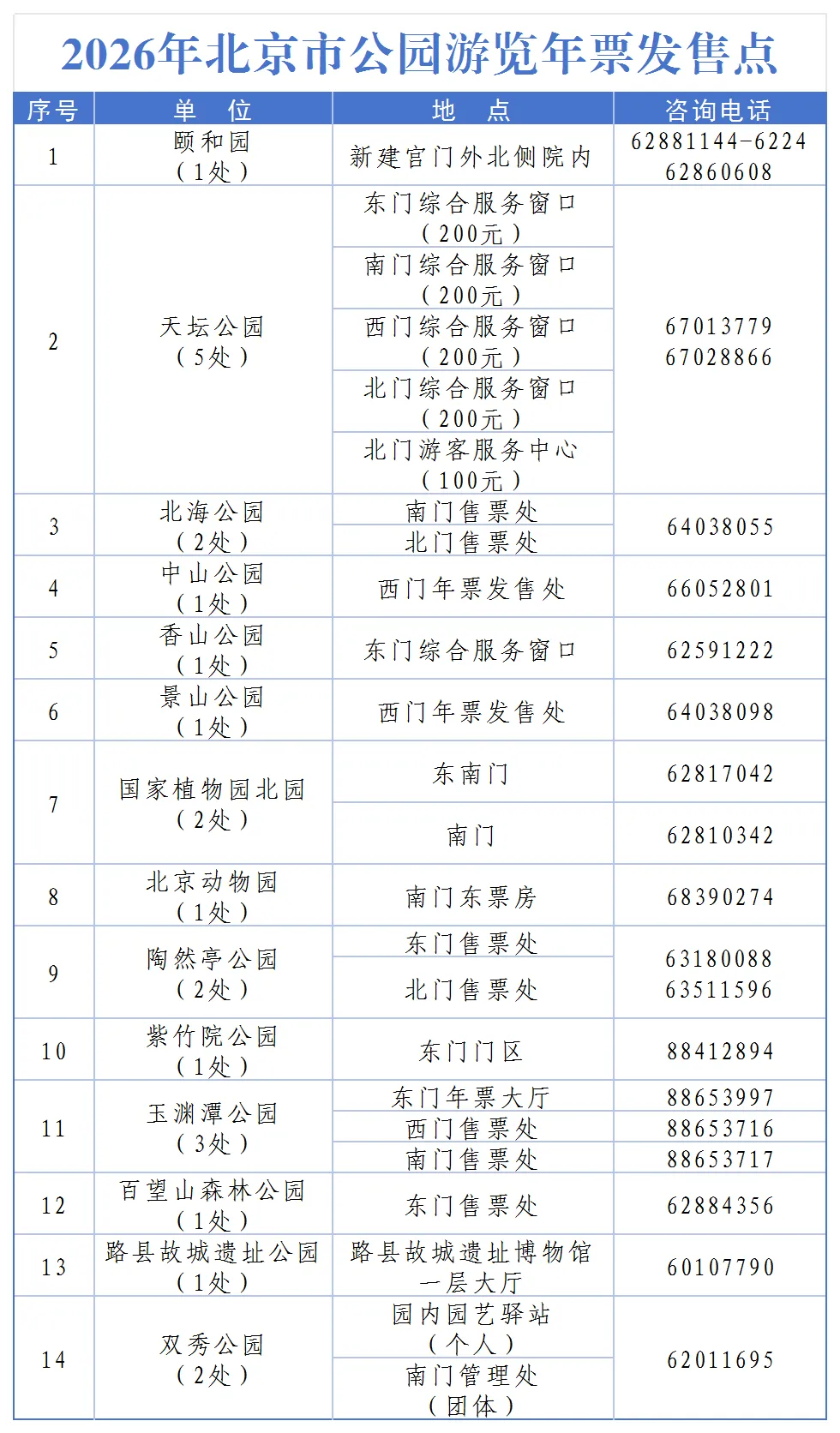 2026年北京市公园游览年票将于12月15日起开始发售,线下集中发售将持续至2026年1月15日,线上发售则到10月20日。