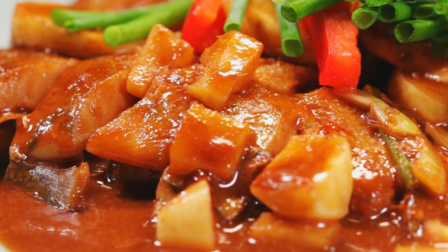 步骤3:慈菇去皮切片,放入锅中,加入适量蚝油番茄酱和生抽调味,烧制成熟即可出锅。
